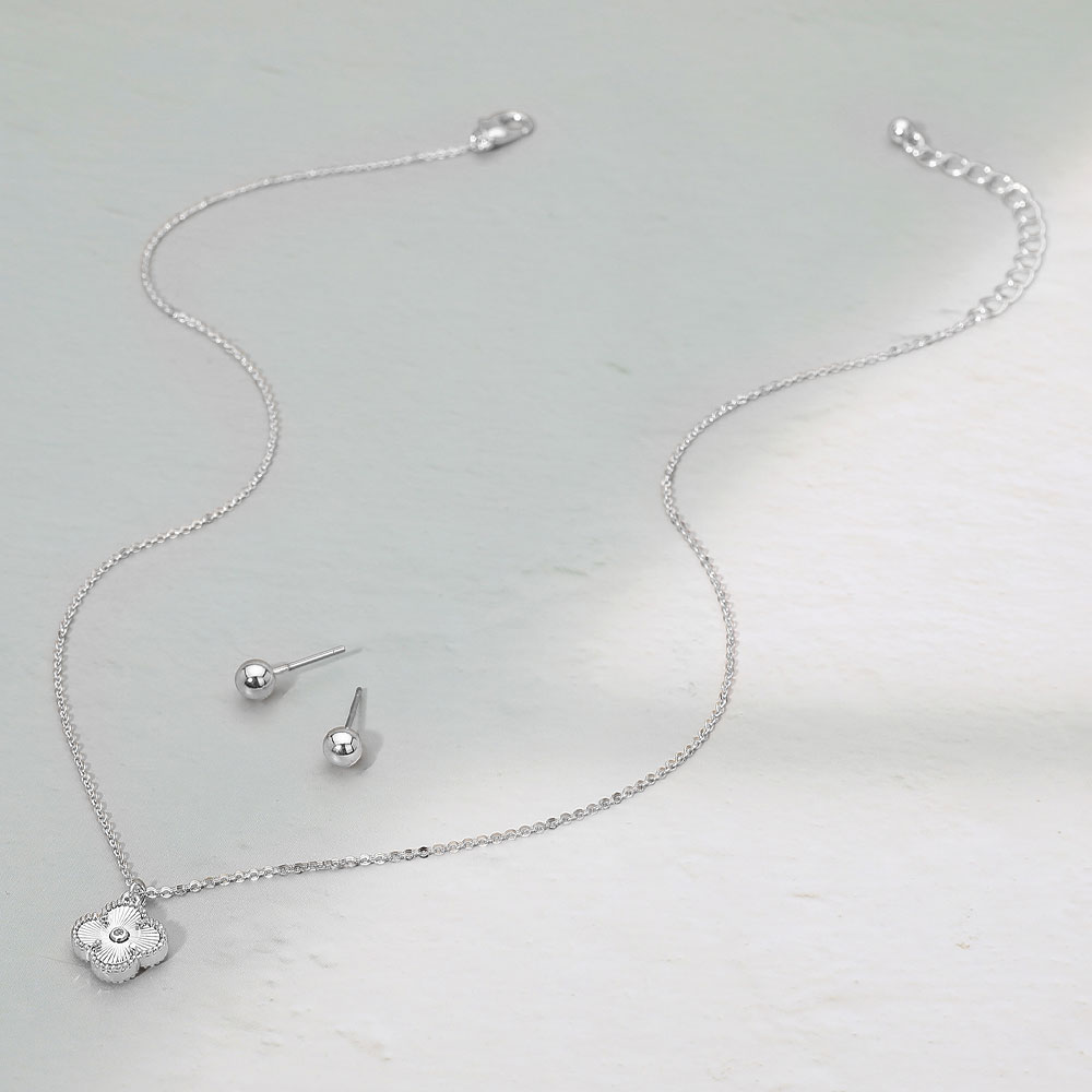 • Chic four-leaf quatrefoil necklace set featuring a delicate clover pendant and matching stud earrings. Its elegant design adds a refined touch of charm and sophistication, perfect for daily wear or gifting, symbolizing luck, beauty, and timeless feminine grace.