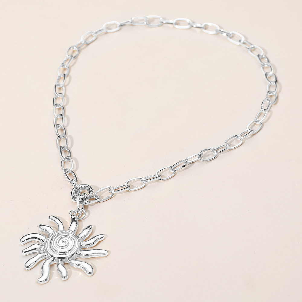 Details • Necklace Size : 16" + 0.5" L • Pendant Size : 1.6" X 2" • Add a touch of radiant charm with this spiral sun pendant chain necklace. Its unique sunburst design and bold link chain create a striking statement piece that captures warmth and vitality. Perfect for layering or wearing solo to elevate any look with effortless elegance. • Lead and Nickel Compliant