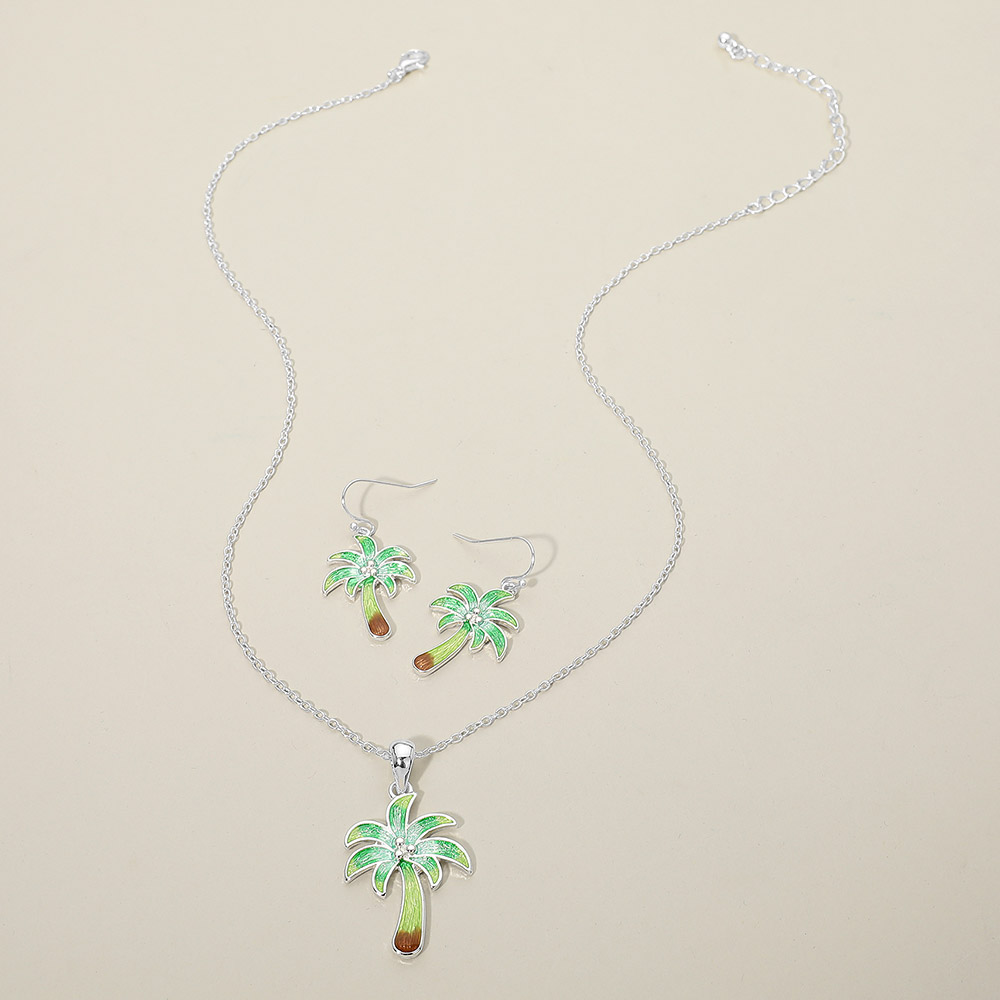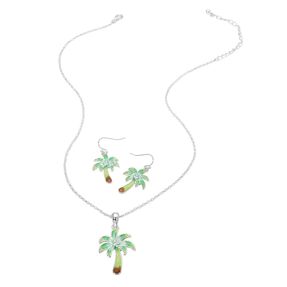 • Palm tree pendant necklace and matching earring set featuring a tropical inspired design that brings a relaxed, vacation ready vibe to any look. Ideal for beach boutiques, resort shops, summer collections, and gift displays. This coordinated jewelry set appeals to customers seeking playful statement accessories, island themed styles, and easy to wear novelty jewelry for warm weather outfits.