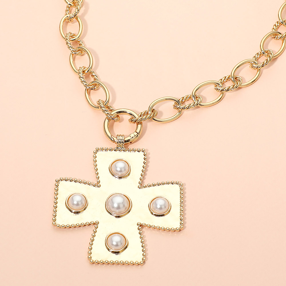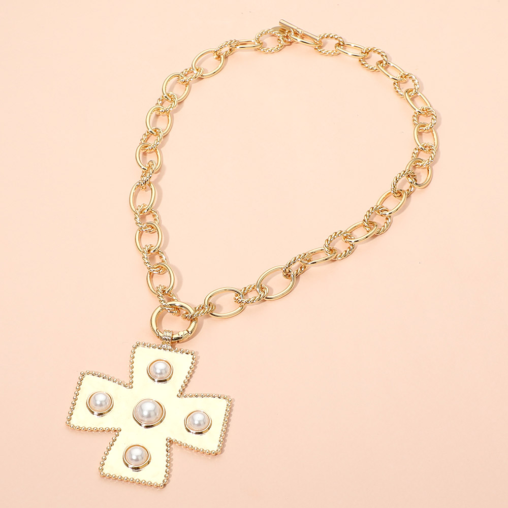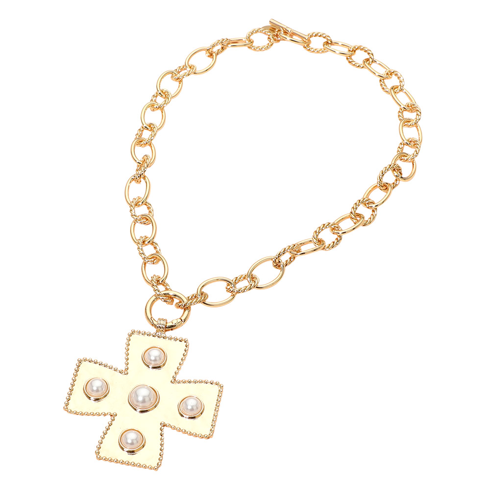 Details • Necklace Size : 19" L • Pendant Size : 2.25" X 2.6" • Toggle Closure • Statement necklace featuring a bold cross pendant accented with smooth beaded details and suspended from a classic link chain. Designed to add symbolic elegance and modern flair to everyday styling or special occasions, this eye-catching piece offers versatile appeal for fashion-forward accessory collections. • Lead and Nickel Compliant