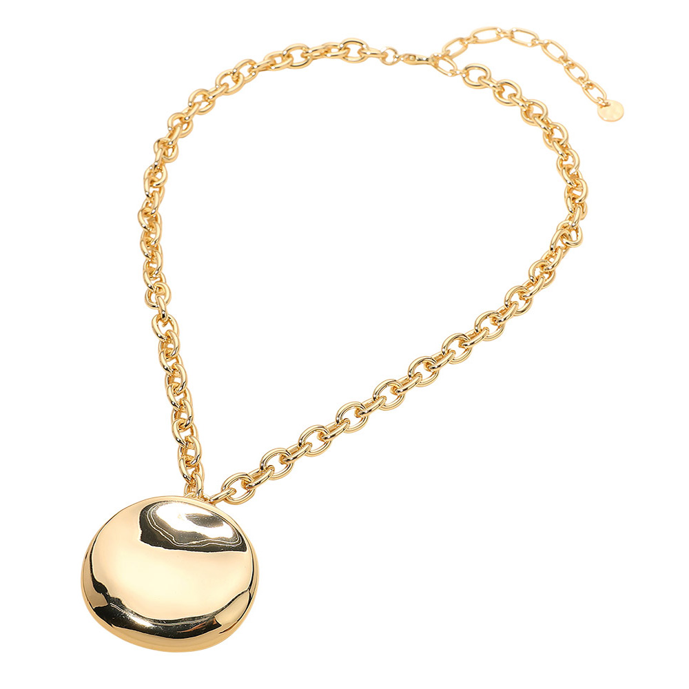 Details • Necklace Size : 18" + 3.5" L • Pendant Size : 2.75" X 1.5" • A sleek necklace featuring a bold round pendant suspended from a refined chain, offering a modern yet timeless statement. Its smooth, radiant finish elevates everyday outfits and special-occasion looks alike, making it a versatile accessory that adds effortless sophistication. • Lead and Nickel Compliant