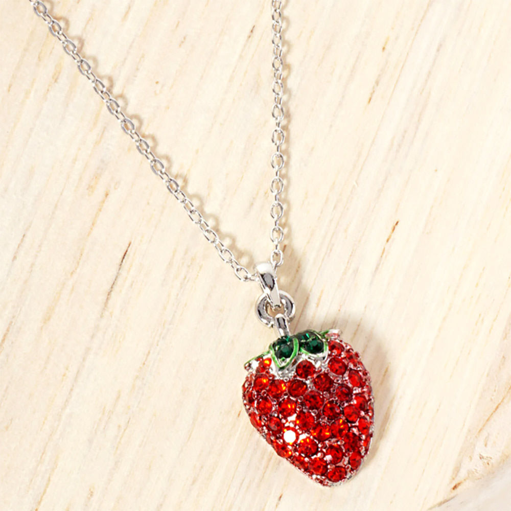 • Add a fun pop of style with this strawberry pendant necklace, beautifully detailed with sparkling rhinestones. A whimsical fruit-inspired accessory that blends charm and elegance, perfect for daily wear, themed outfits, or as a unique gift for someone who loves playful jewelry.