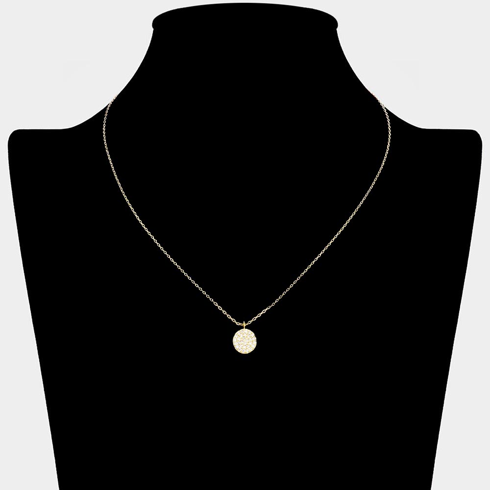 Details • Necklace Size : 16.5" + 2" L • Pendant Size : 0.3" X 0.3" • Elegant disc pendant necklace featuring a sparkling cz stone-accented charm on a delicate chain. Perfect for everyday wear or layering, offering a simple yet refined touch. A timeless accessory suitable for gifting or adding subtle shine to any look. • Made In Korea • Gold Dipped • CZ Cubic Zirconia