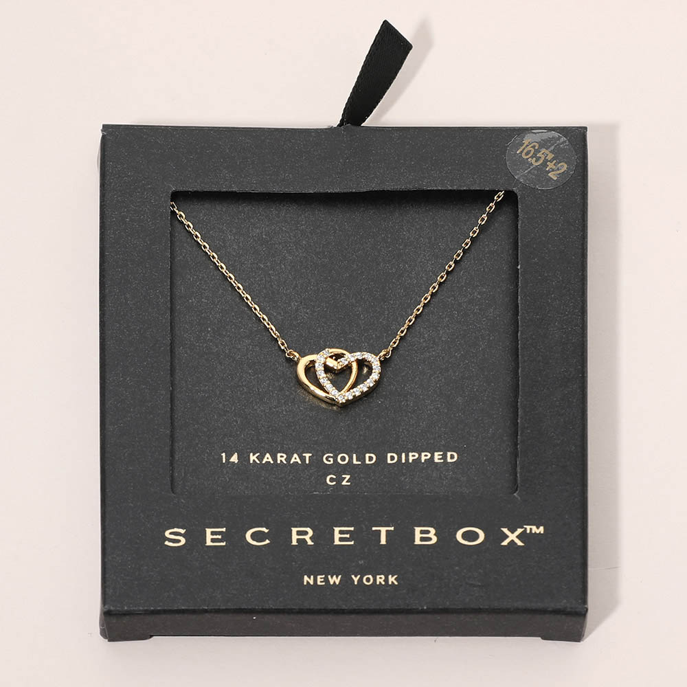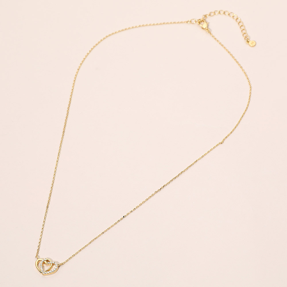 Details • Necklace Size : 16.5" + 2" L • Pendant Size : 0.5" X 0.4" • Elegant double heart necklace featuring a sparkling accent detail that symbolizes love and connection. Designed for effortless everyday wear, this delicate piece layers beautifully or stands alone, making it a meaningful gift choice for anniversaries, birthdays, holidays, and romantic occasions. • CZ Cubic Zirconia • Gold Dipped