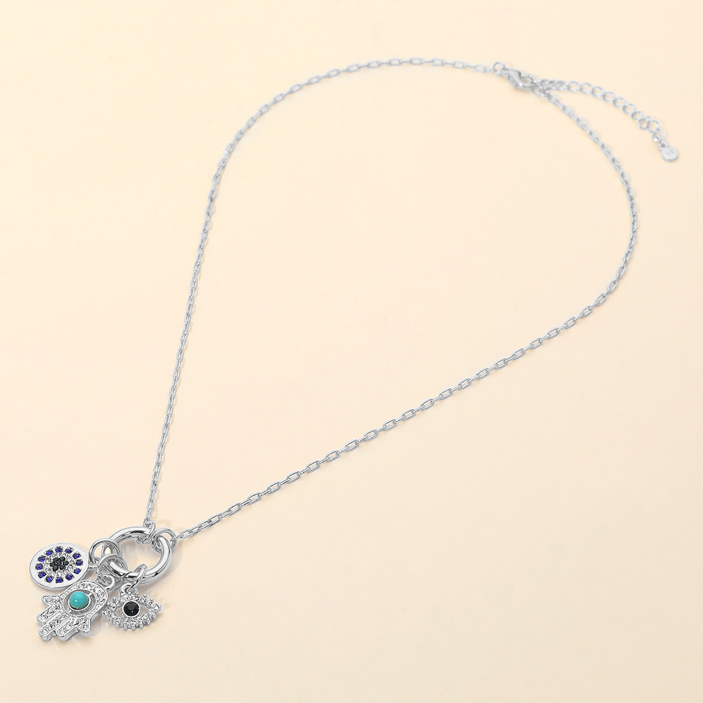 Details • Necklace Size : 16.5" + 2" L • Pendant Size : 1.25" X 1" • A striking multi-charm necklace featuring a protective hand, an eye motif, and a round charm with sparkling accents. The layered symbolic design adds personality and meaning, making it perfect for daily wear, gifting, or styling as a standout statement piece. • Sterling Silver Dipped