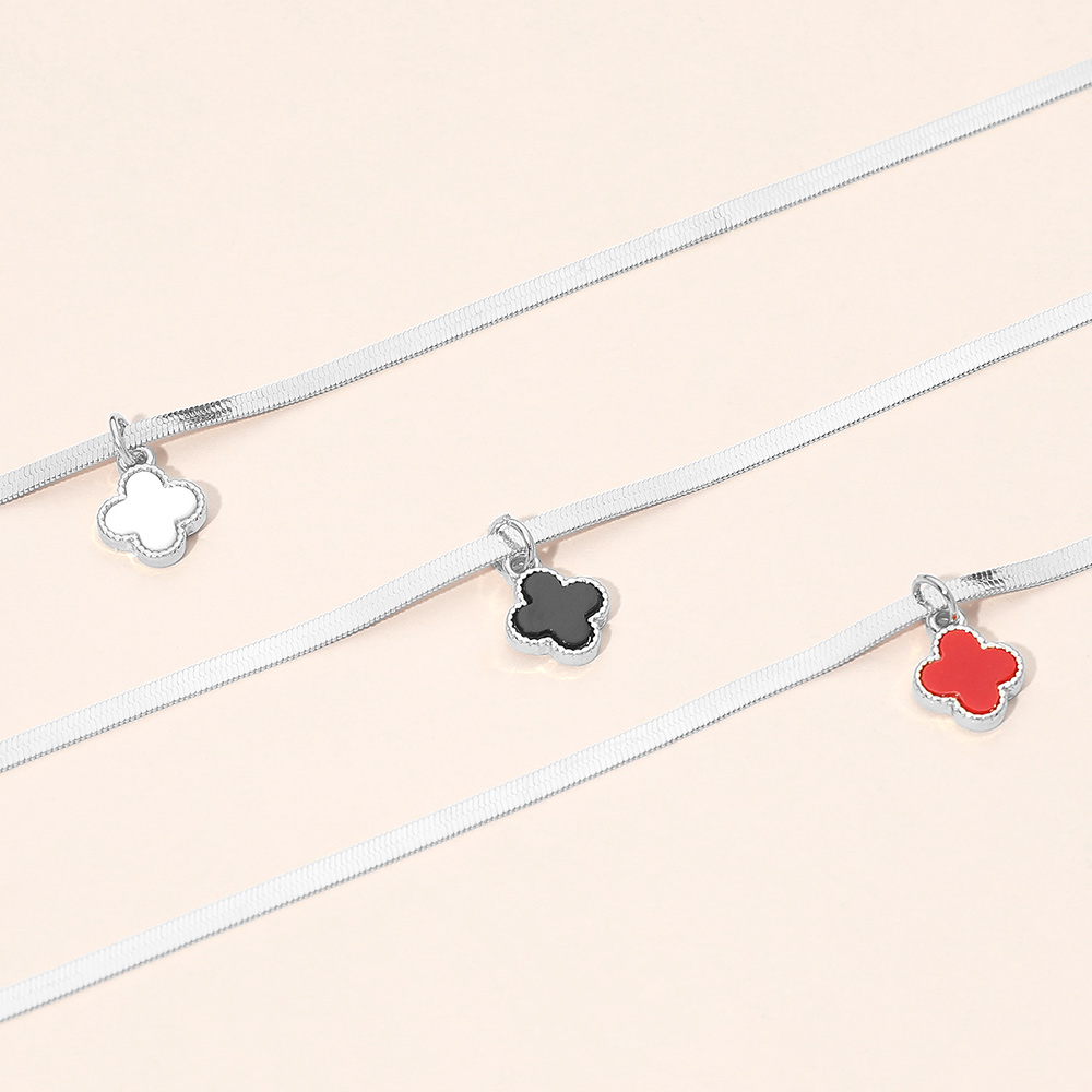 Details • Necklace Size : 18" + 3.25" L • Pendant Size : 0.4" X 0.5" • This minimalist flat chain necklace features a delicate quatrefoil shaped pendant with a sleek silhouette and adjustable length for easy styling. Designed for everyday wear, it layers effortlessly with other necklaces and adds a clean, modern accent to casual looks, work outfits, or gift ready accessory collections for boutiques and online shops. • Lead and Nickel Compliant • Sterling Silver Dipped