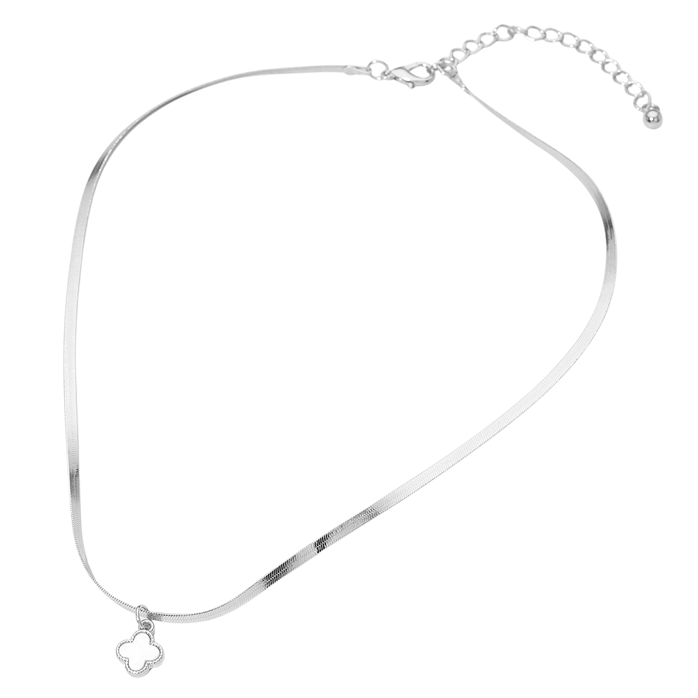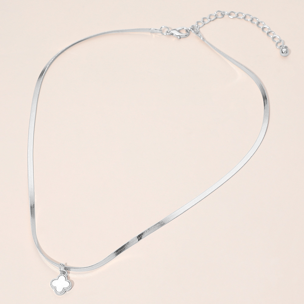 Details • Necklace Size : 18" + 3.25" L • Pendant Size : 0.4" X 0.5" • This minimalist flat chain necklace features a delicate quatrefoil shaped pendant with a sleek silhouette and adjustable length for easy styling. Designed for everyday wear, it layers effortlessly with other necklaces and adds a clean, modern accent to casual looks, work outfits, or gift ready accessory collections for boutiques and online shops. • Lead and Nickel Compliant • Sterling Silver Dipped