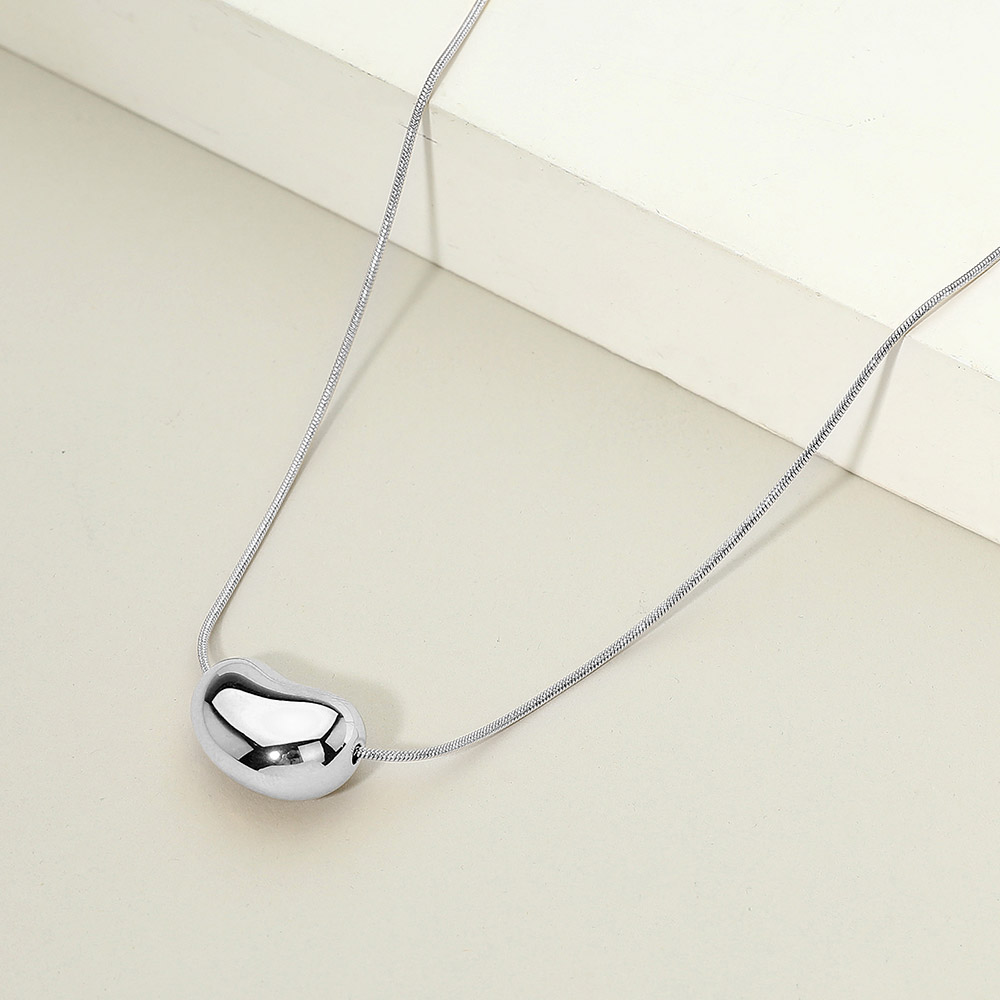 Details • Necklace Size : 16" + 2" L • Pendant Size : 0.7" X 0.5" • This stainless steel necklace highlights a smooth bean-shaped pendant on a fine chain, blending modern simplicity with artistic flair. Its polished finish adds refined elegance, making it a versatile accessory that complements both everyday and sophisticated styles effortlessly. • Stainless Steel
