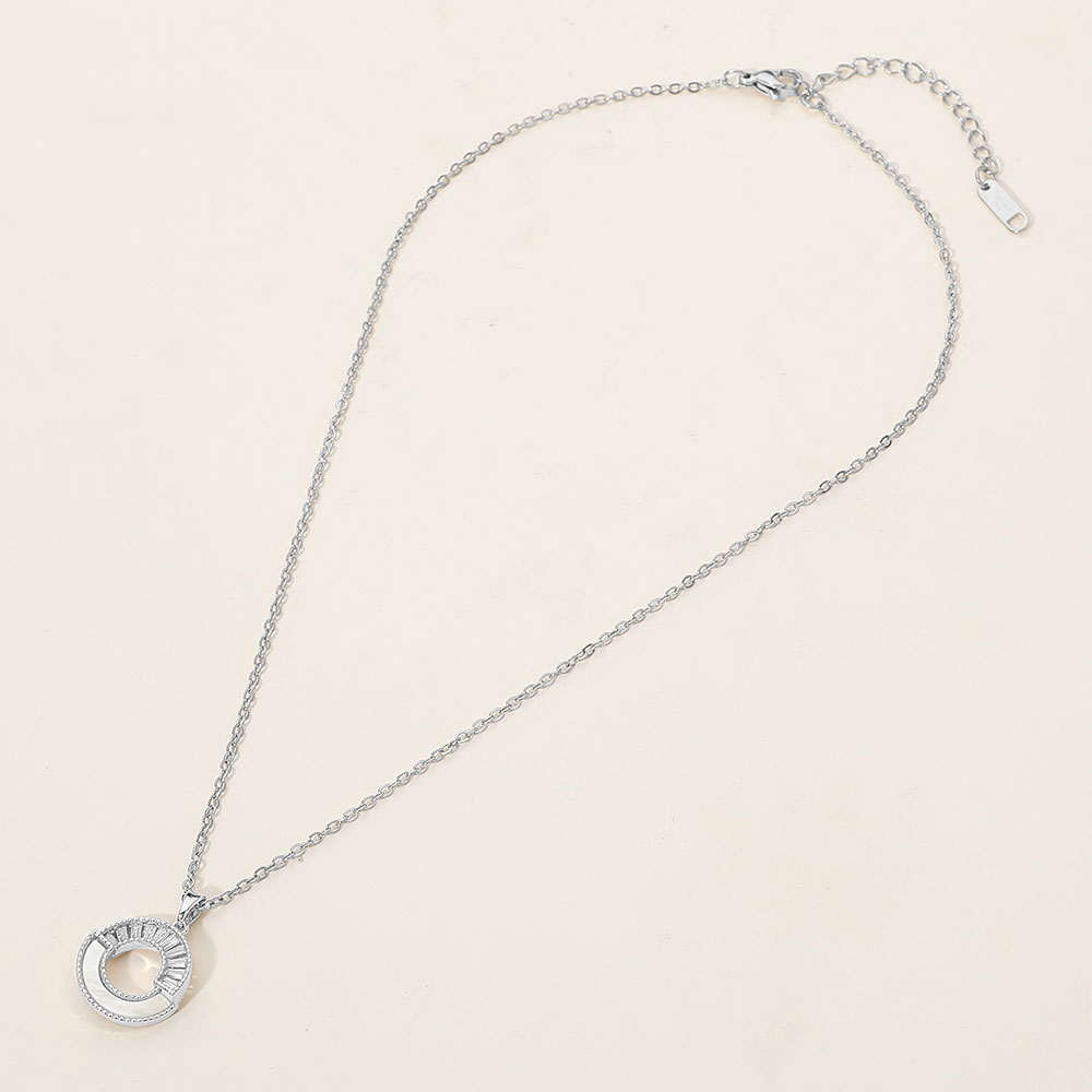 Details • Necklace Size : 15.5" + 2" L • Pendant Size : 0.6" X 0.8" • Modern open circle pendant necklace accented with a refined cz pave-style mother of pearl detail for subtle sparkle and dimension. This versatile necklace delivers a clean, contemporary look that transitions effortlessly from everyday wear to special occasions. A timeless, easy-to-style piece ideal for layering or wearing solo, perfect for boutiques seeking minimalist yet eye-catching jewelry. • CZ Cubic Zirconia • Stainless Steel
