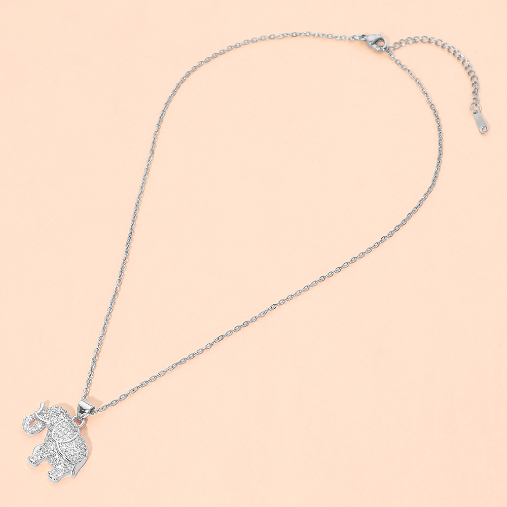 Details • Necklace Size : 15.5" + 2.25" L • Pendant Size : 1" X 0.9" • This elephant charm pendant necklace showcases a sparkling, detailed silhouette that symbolizes luck, wisdom, and protection. Designed for everyday wear or special occasions, it makes a meaningful gift and a stylish addition to boutique jewelry collections, perfect for layering or wearing alone. • CZ Cubic Zirconia • Stainless Steel