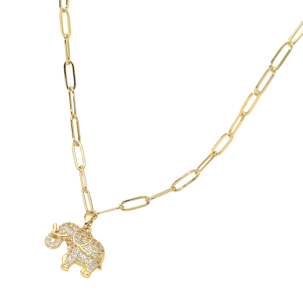 Details • Necklace Size : 15.75" + 2.25" L • Pendant Size : 1" X 09" • This elephant charm link chain pendant necklace features a detailed, symbolic design that represents luck, strength, and wisdom. A versatile statement piece for everyday wear, gifting, or boutique collections, it pairs well with casual or elevated looks and layers effortlessly with other necklaces. • CZ Cubic Zirconia • Stainless Steel