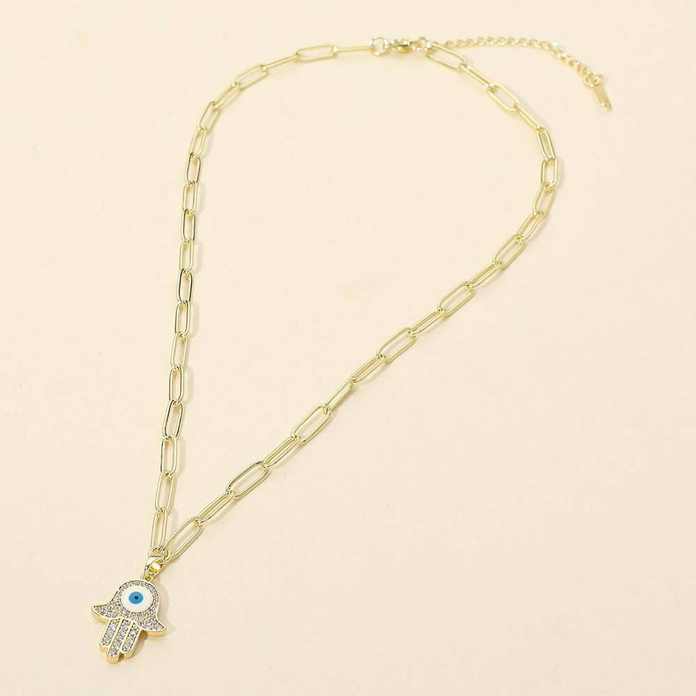 Details • Necklace Size : 16" + 2.25" L • Pendant Size : 0.6" X 1.1" • Symbolic hamsa charm necklace featuring an evil eye design that represents protection, positivity, and good fortune. Designed for everyday wear or meaningful gifting, this necklace offers a balanced blend of spiritual symbolism and modern style. Easy to layer or wear solo, it’s a versatile accessory for boutiques seeking trend-driven jewelry with lasting appeal. • CZ Cubic Zirconia • Stainless Steel