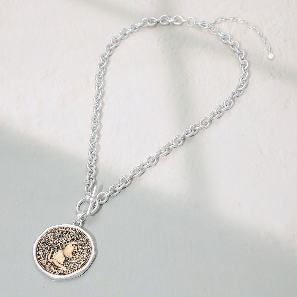 • Elevate your style with this two-tone coin medallion chain necklace featuring a detailed round pendant suspended from a bold link silhouette. A versatile statement piece that layers beautifully or shines solo, perfect for everyday wear or special occasions.