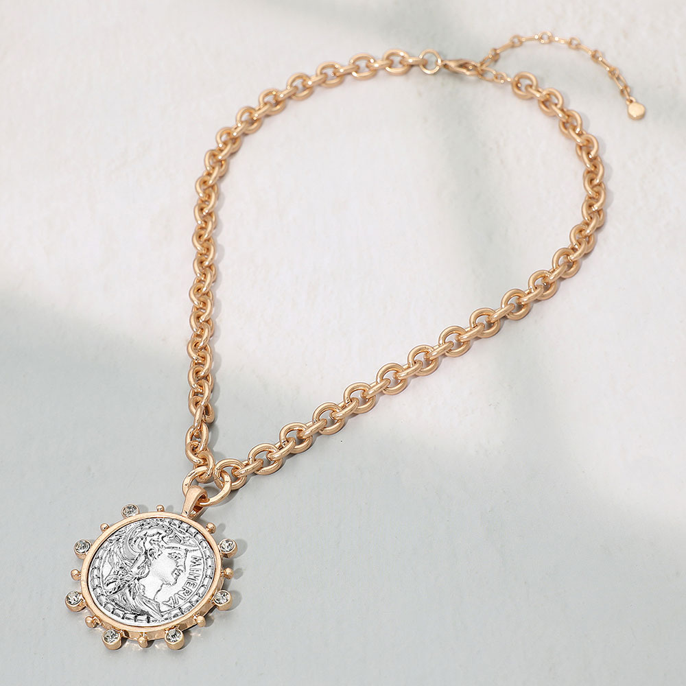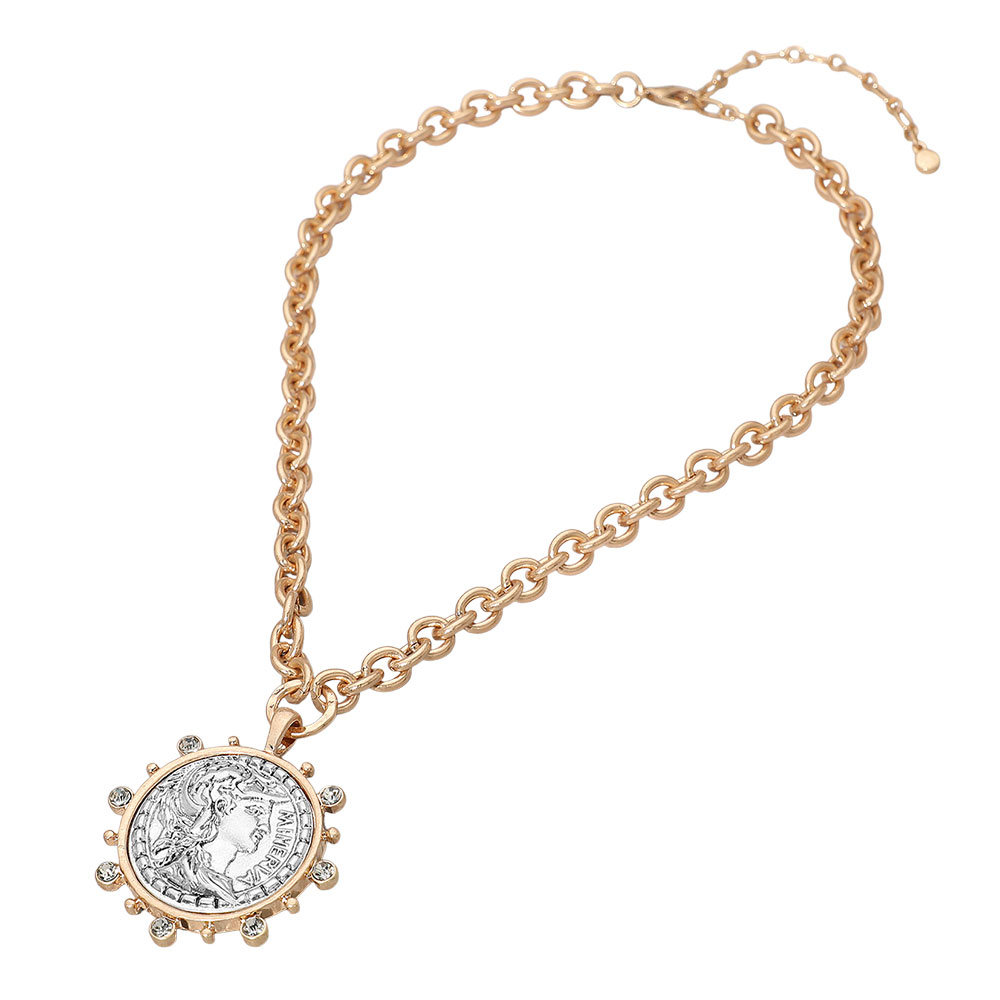 Details • Necklace Size : 16" + 3" L • Pendant Size : 1.7" X 1.8" • Make a statement with this framed coin pendant chain necklace featuring a detailed medallion surrounded by subtle sparkle accents on a bold link design. Perfect for layering or wearing solo, it adds timeless character and modern style to any look. • Lead and Nickel Compliant
