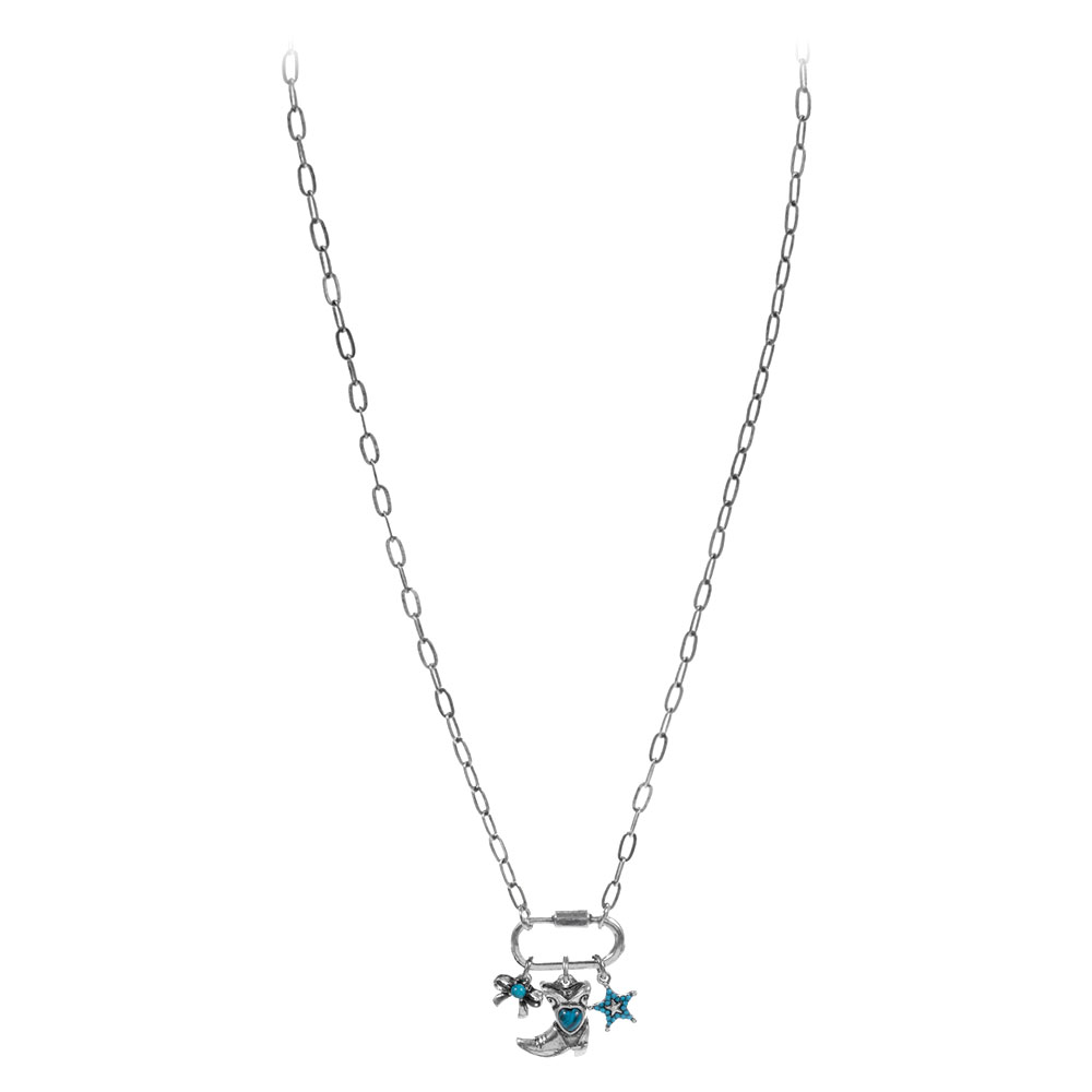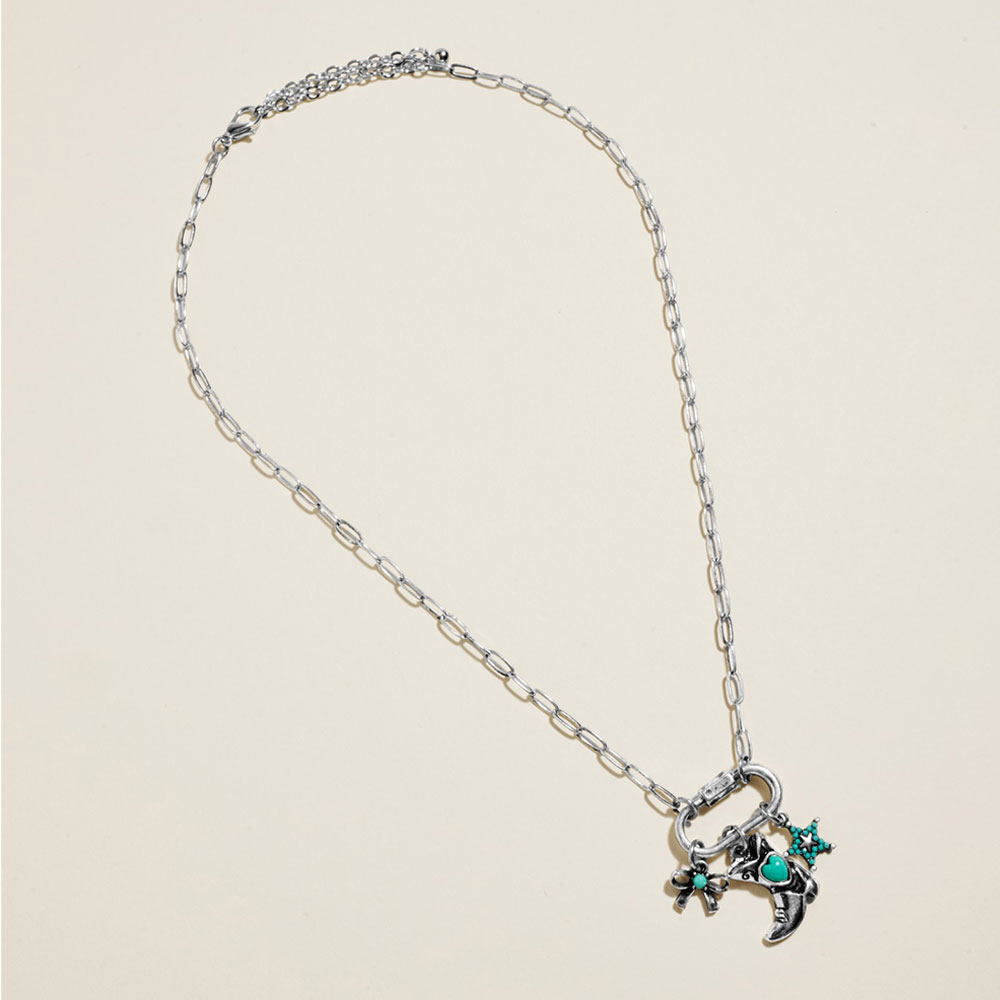 • Delicate chain necklace featuring three coordinated dangling charms arranged at the center for a playful Western-inspired accent. Designed to add gentle movement and character, it layers easily with other pieces or shines solo as a subtle everyday statement.
