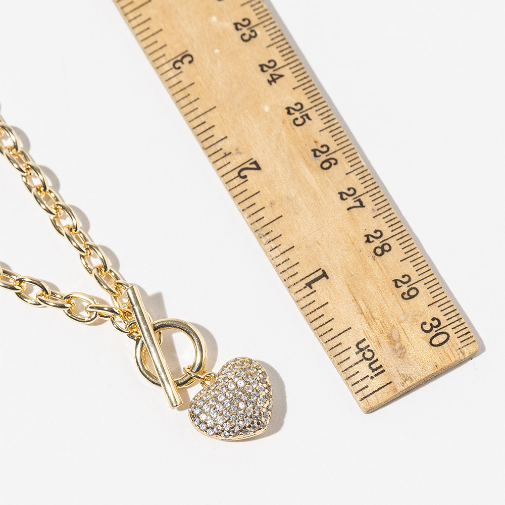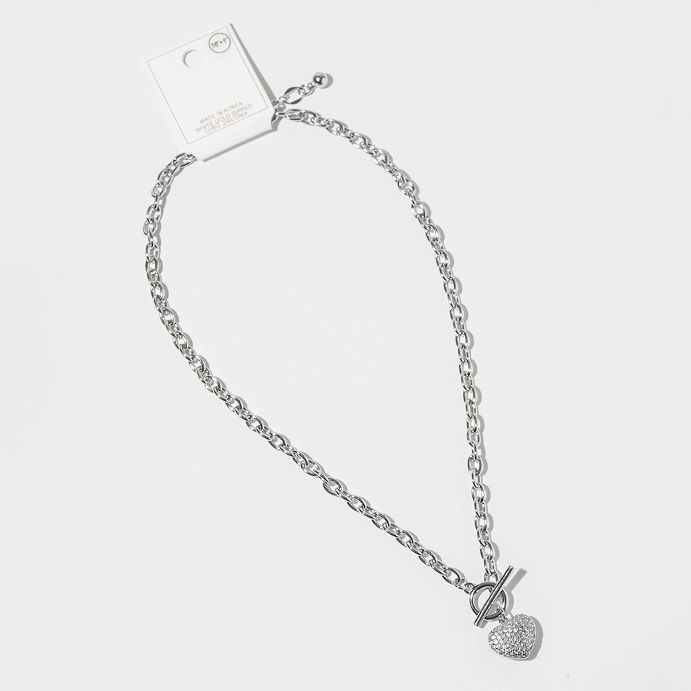 Details • Necklace Size : 18" + 1" L • Pendant Size : 0.7" X 0.6" • Add a chic touch to your look with this textured heart toggle pendant necklace. Featuring a sparkling heart charm on a bold link chain, it combines modern style with timeless elegance. Perfect for everyday wear or special occasions, it layers beautifully and makes a thoughtful gift for any jewelry lover. • CZ Cubic Zirconia • Gold Dipped • Lead and Nickel Compliant • Made In Korea