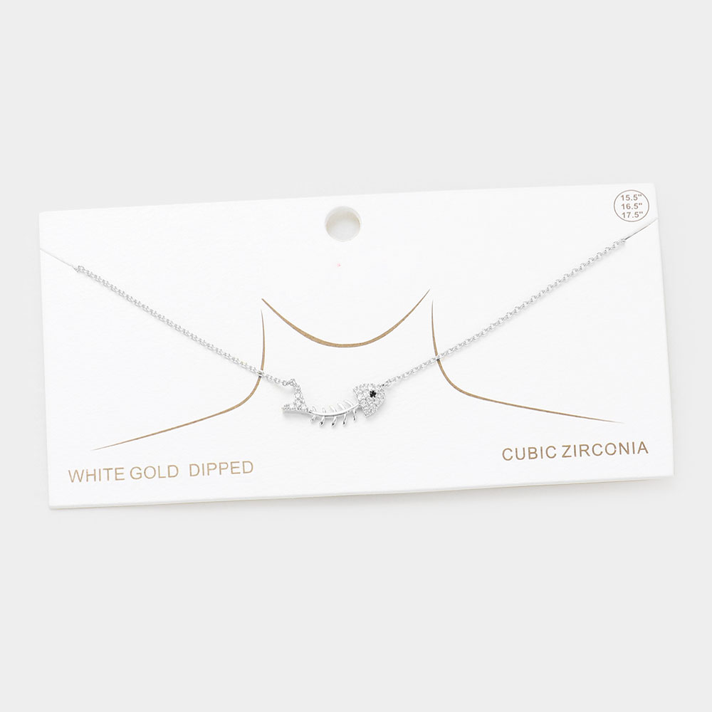 White Gold Dipped CZ Fishbone Pendant Necklace