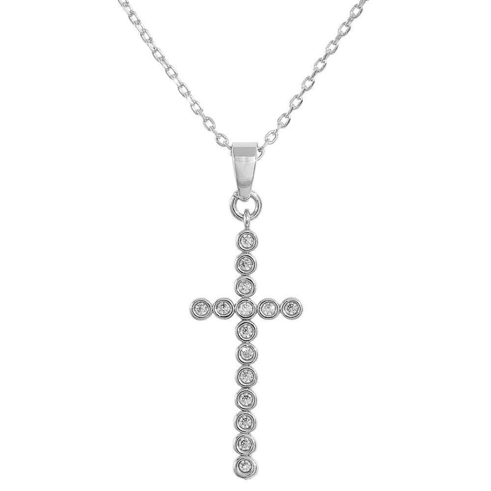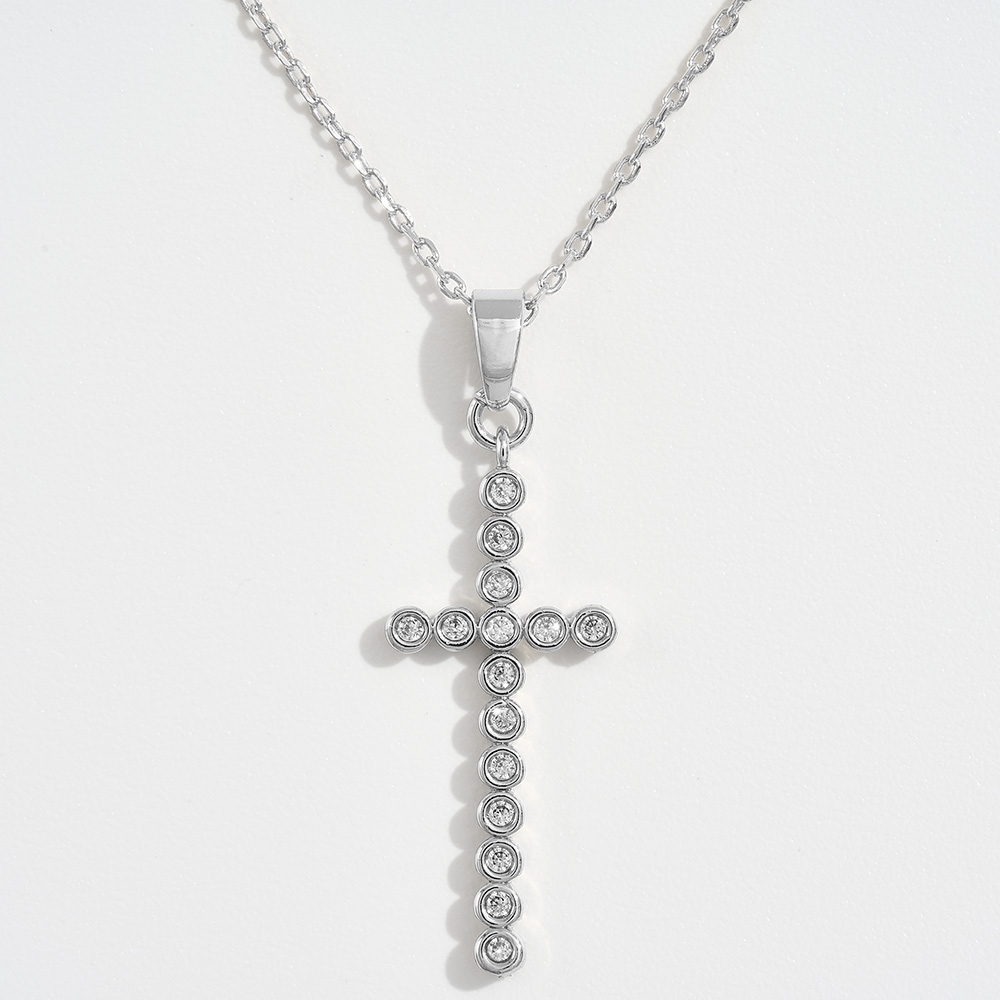 Details • Necklace Size : 16" + 2" L • Pendant Size : 0.5" X 1.25" • This cross pendant necklace features a sleek row of bezel-set round stones, creating a refined and radiant design. A modern take on a timeless symbol, it’s perfect for adding elegance to everyday style or gifting as a meaningful keepsake. • CZ Cubic Zirconia • Gold Dipped • Made In Korea