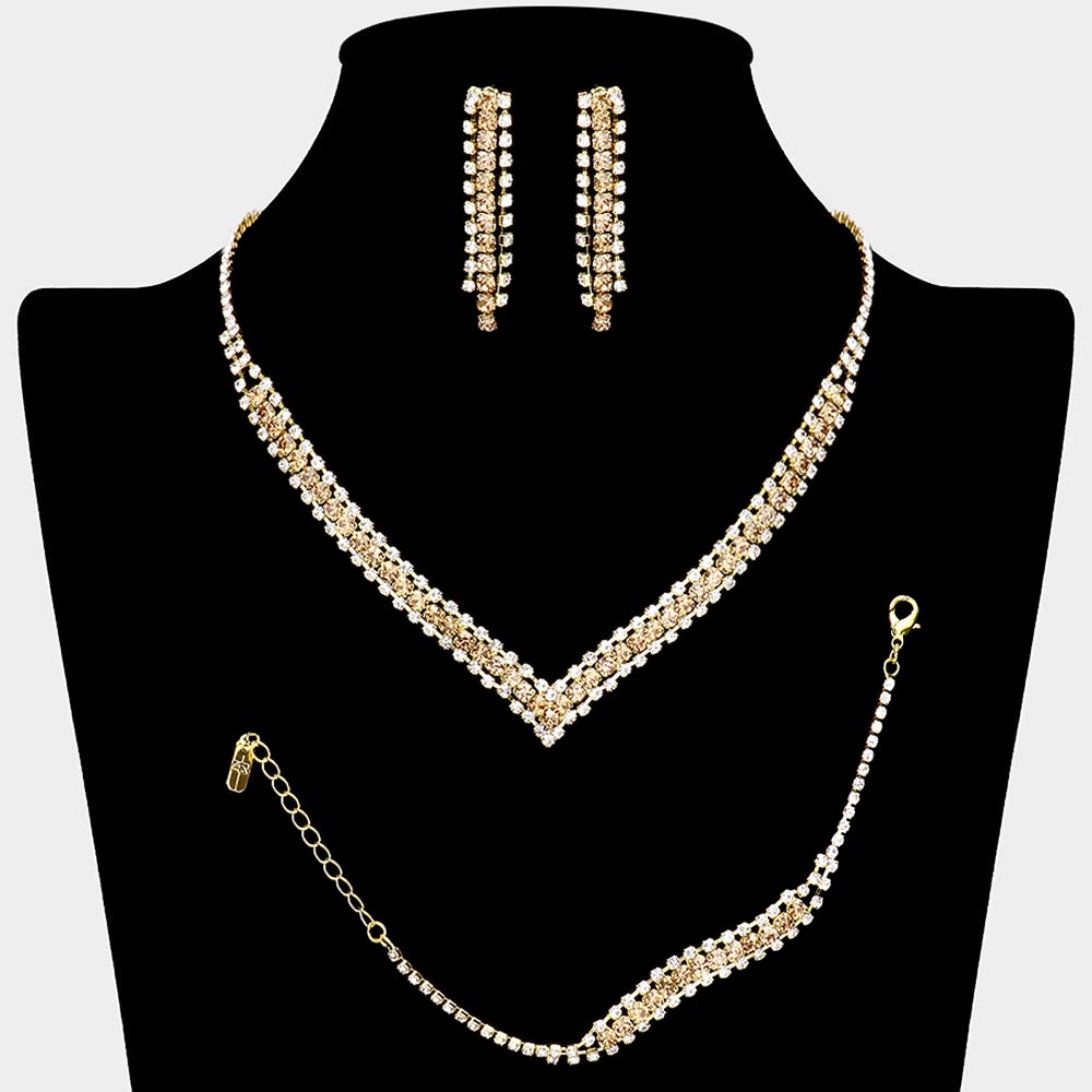 • Elevate any special occasion with this refined jewelry set featuring a matching necklace, bracelet, and earrings. Its sparkling rhinestone arrangement creates a cohesive, eye-catching look designed to enhance formal outfits with timeless sophistication and graceful shine.
