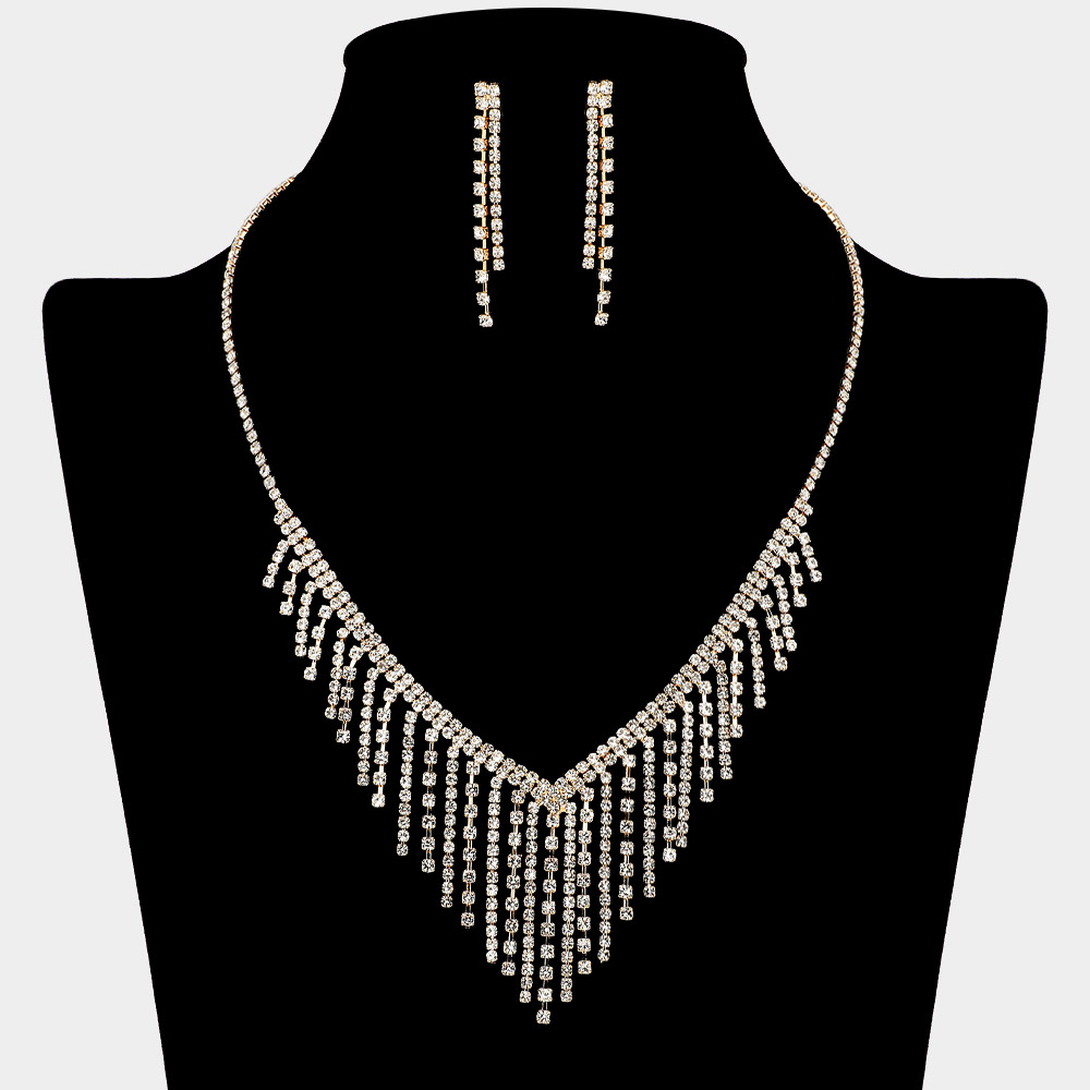 Details • Necklace Size : 17" + 4" L • Decor Size : 1.8" L • Earrings Size : 1.8" L • Add a touch of dramatic elegance with this Cascading Fringe Crystal Necklace and Earring Set. Designed with layered strands of shimmering stones that flow beautifully, this statement set enhances evening gowns and formal attire with radiant sparkle and sophisticated allure for any special occasion. • Lead and Nickel Compliant