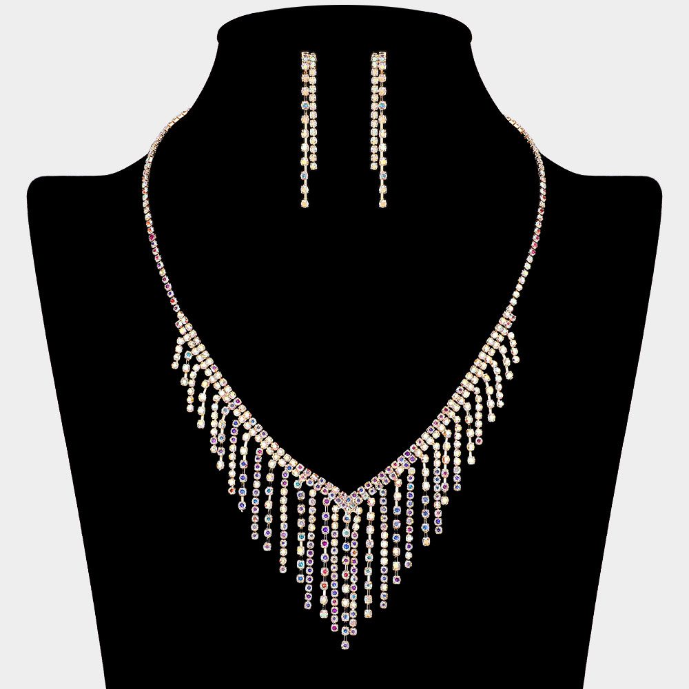 Details • Necklace Size : 17" + 4" L • Decor Size : 1.8" L • Earrings Size : 1.8" L • Add a touch of dramatic elegance with this Cascading Fringe Crystal Necklace and Earring Set. Designed with layered strands of shimmering stones that flow beautifully, this statement set enhances evening gowns and formal attire with radiant sparkle and sophisticated allure for any special occasion. • Lead and Nickel Compliant