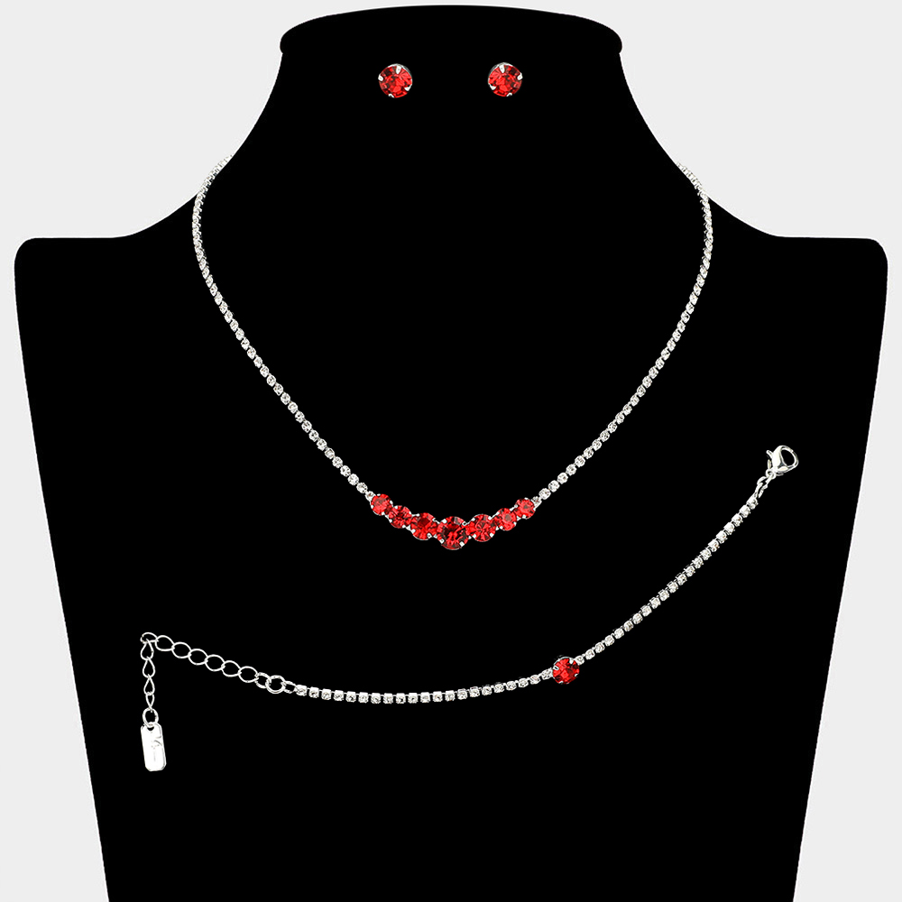 Details • Necklace Size : 15" + 4.5" L • Decor Size : 0.3" L • Bracelet Size : 0.25" H, 5.25" + 2.25" L • Earrings Size : 0.25" L • Timeless matching necklace, stud earring, and bracelet set designed with a clean round stone centerpiece for effortless elegance. Ideal for weddings, formal events, parties, and everyday special occasion styling. A versatile set that delivers refined sparkle and coordinated sophistication.