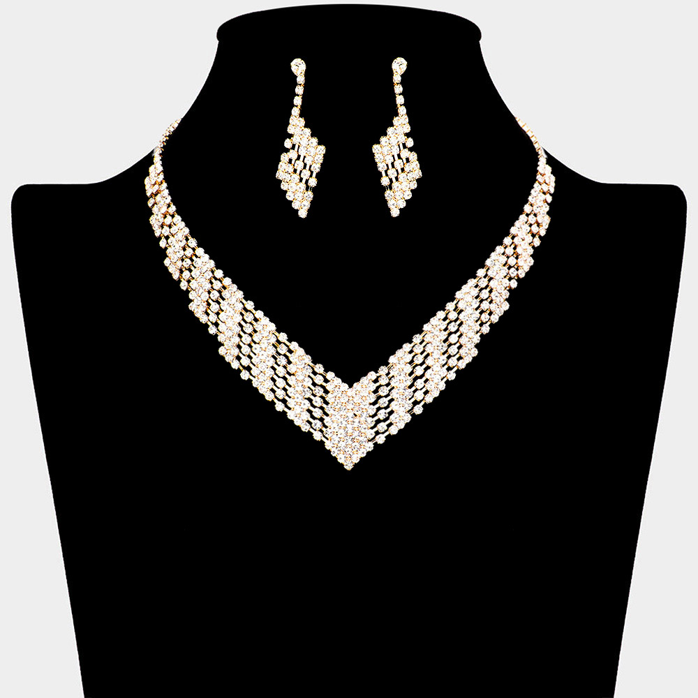 • Shine with sophistication in this V-Pattern Crystal Statement Necklace and Earring Set. Featuring a cascading geometric design that catches the light beautifully, this glamorous duo adds timeless sparkle and elegance—perfect for weddings, galas, or unforgettable evening occasions.