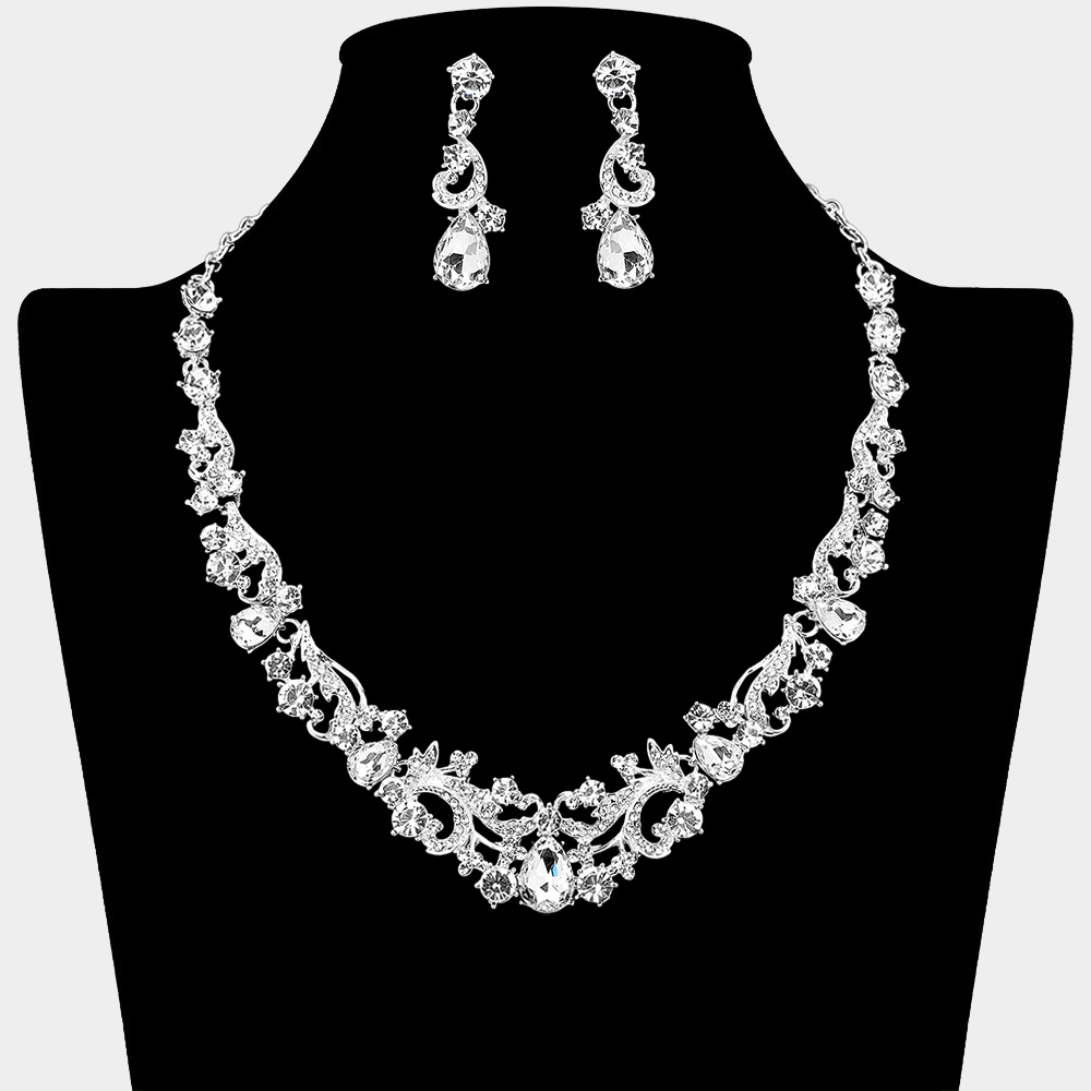 • Stunning jewelry set featuring an ornate crystal necklace with teardrop accents and matching earrings. Perfect for weddings, proms, or formal occasions, adding sophistication and timeless sparkle to any outfit.