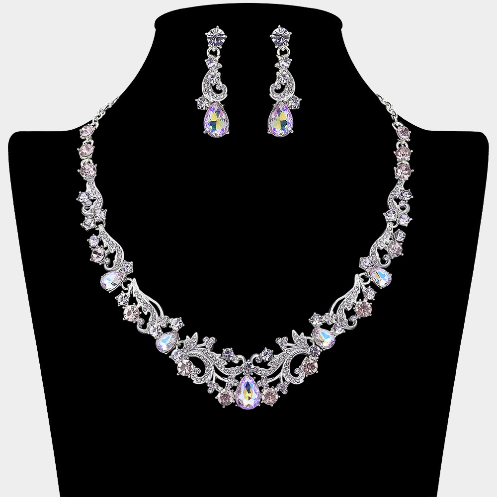 • Stunning jewelry set featuring an ornate crystal necklace with teardrop accents and matching earrings. Perfect for weddings, proms, or formal occasions, adding sophistication and timeless sparkle to any outfit.