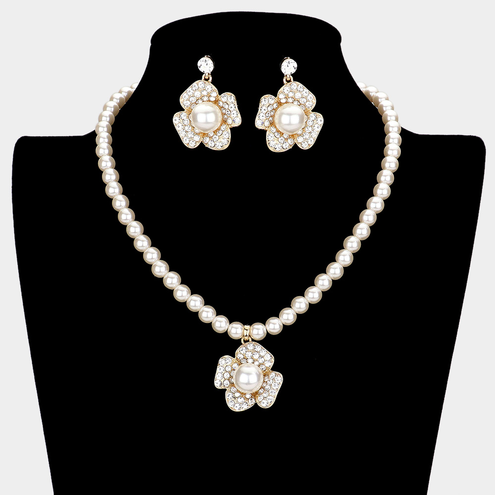 Details • Necklace Size : 15.5" + 3" L • Pendant Size : 1" x 1.3" • Earring Size : 1.5" L • Add a touch of grace with this floral pearl necklace and earring set, designed with sparkling crystal accents and a delicate flower motif. Perfect for weddings, evening events, or formal occasions, this refined jewelry set brings timeless beauty and sophistication to any look.