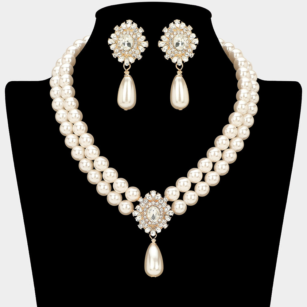 Details • Necklace Size : 15.5" + 3" L • Decor Size : 2.25" L • Earrings Size : 2.25"L • Shine with sophistication in this crystal pearl necklace and earring set featuring radiant pearls, sparkling crystal accents, and elegant teardrop pendants. Perfect for weddings, galas, or evening events, this timeless jewelry ensemble enhances any outfit with refined luxury and grace.