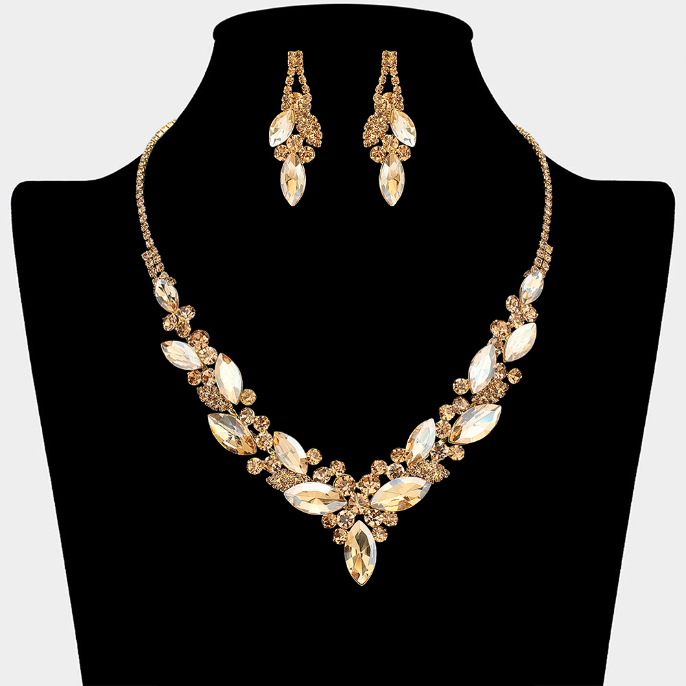 • Make a bold impression with this statement necklace and earring set featuring striking marquise and teardrop accents arranged in an elegant silhouette. Designed for formal events, evening wear, proms, and special celebrations, this coordinated set delivers eye-catching sparkle and confident, glamorous style.