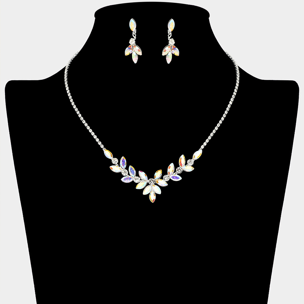 • This refined necklace and matching earring set features a leaf-inspired crystal arrangement that frames the neckline with elegant sparkle. Designed for weddings, bridal parties, formal events, and evening wear, it offers a graceful statement look that enhances dresses, gowns, and special occasion styling with timeless appeal.