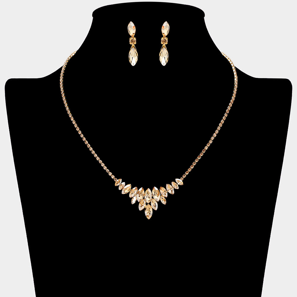 • Elegant marquise cut rhinestone statement set featuring a dramatic V-shaped drop necklace constructed from cascading stones and a delicate line chain. The sophisticated necklace pairs perfectly with the included dangle earrings. Ideal accessories for brides, proms, galas, and formal events. This stunning set makes a bold and dazzling style statement.