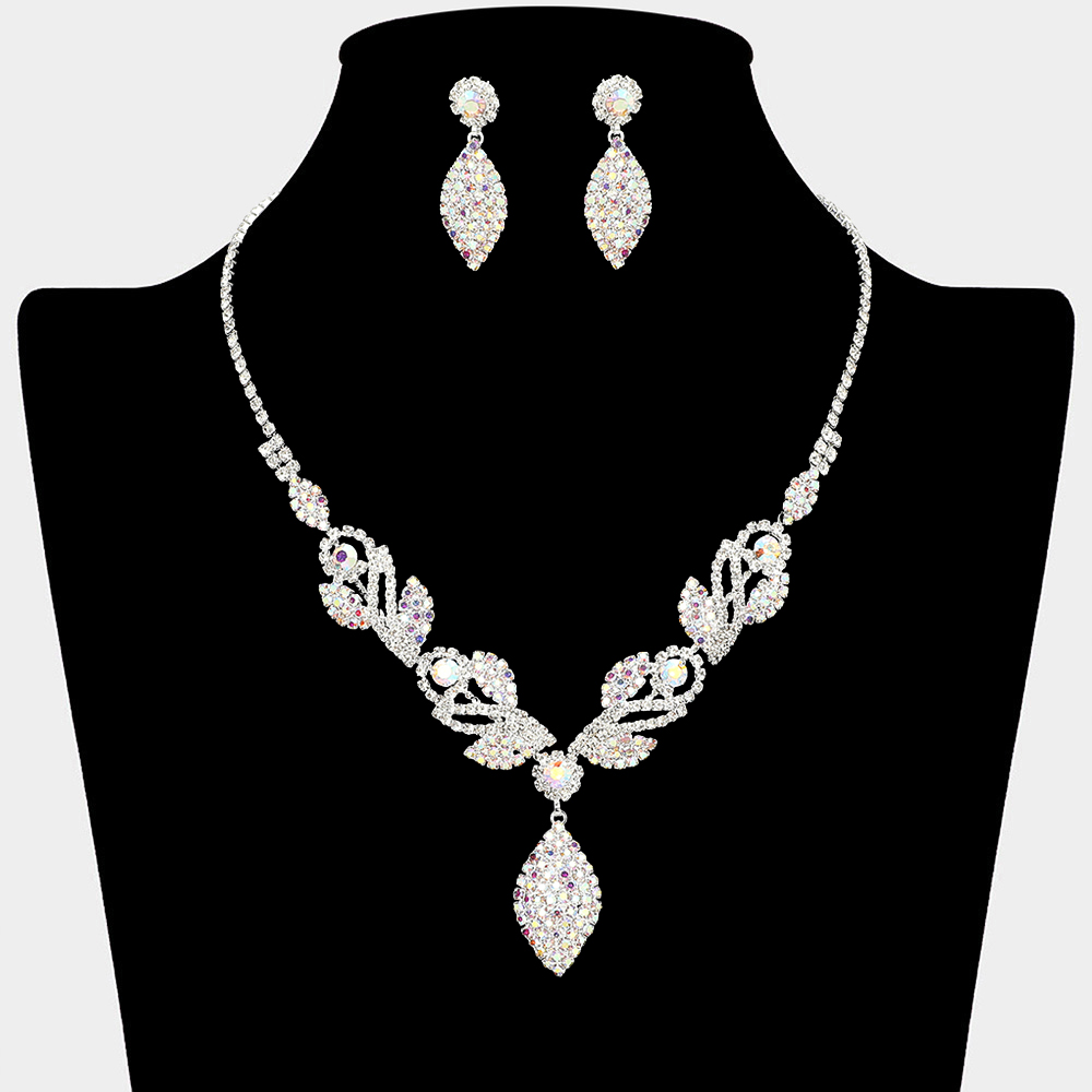 • This elegant necklace and earring set features a detailed crystal drop design with graceful symmetry and radiant sparkle. Designed to elevate formal looks, it is ideal for weddings, proms, galas, and evening events, offering a refined statement that enhances gowns and special occasion outfits with timeless glamour.