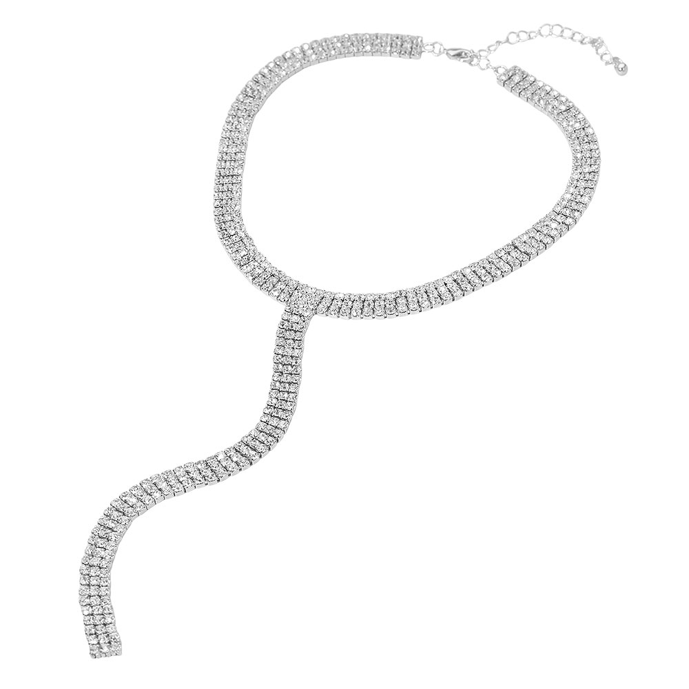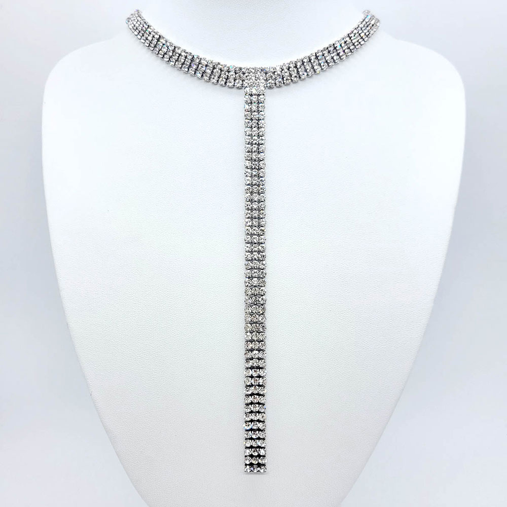 Details • Necklace Size : 15" + 3" L • Decor Size : 6.75" L • Glamorous Y-shaped rhinestone necklace with a cascading drop design that sparkles beautifully. Adjustable for comfort, this statement jewelry piece is perfect for evening wear, parties, weddings, and formal occasions. • Lead and Nickel Compliant • Sterling Silver Dipped
