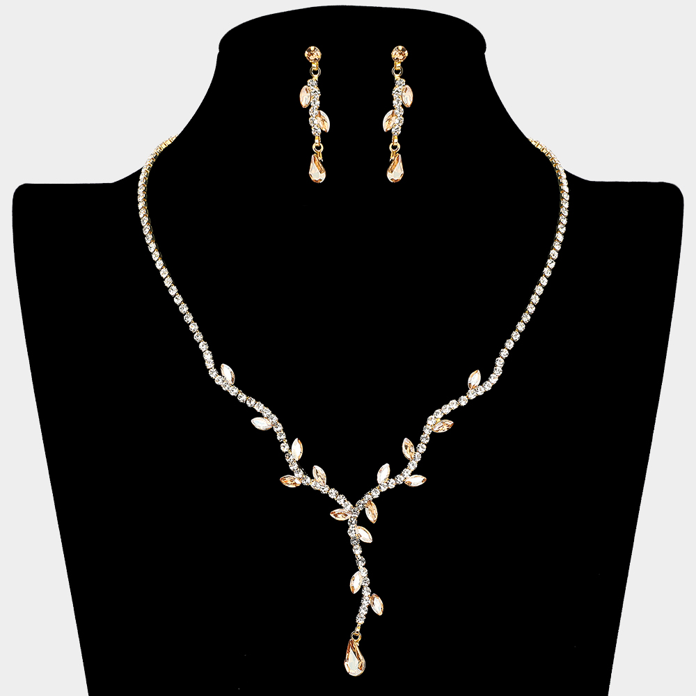 Details • Necklace Size : 16" + 4" L • Decor Size : 1.75" L • Earring Size : 1.5" L • Elegant necklace and earring set with shimmering leaf-shaped stones and a delicate drop pendant. Perfect for weddings, proms, and special events for a refined and glamorous look.