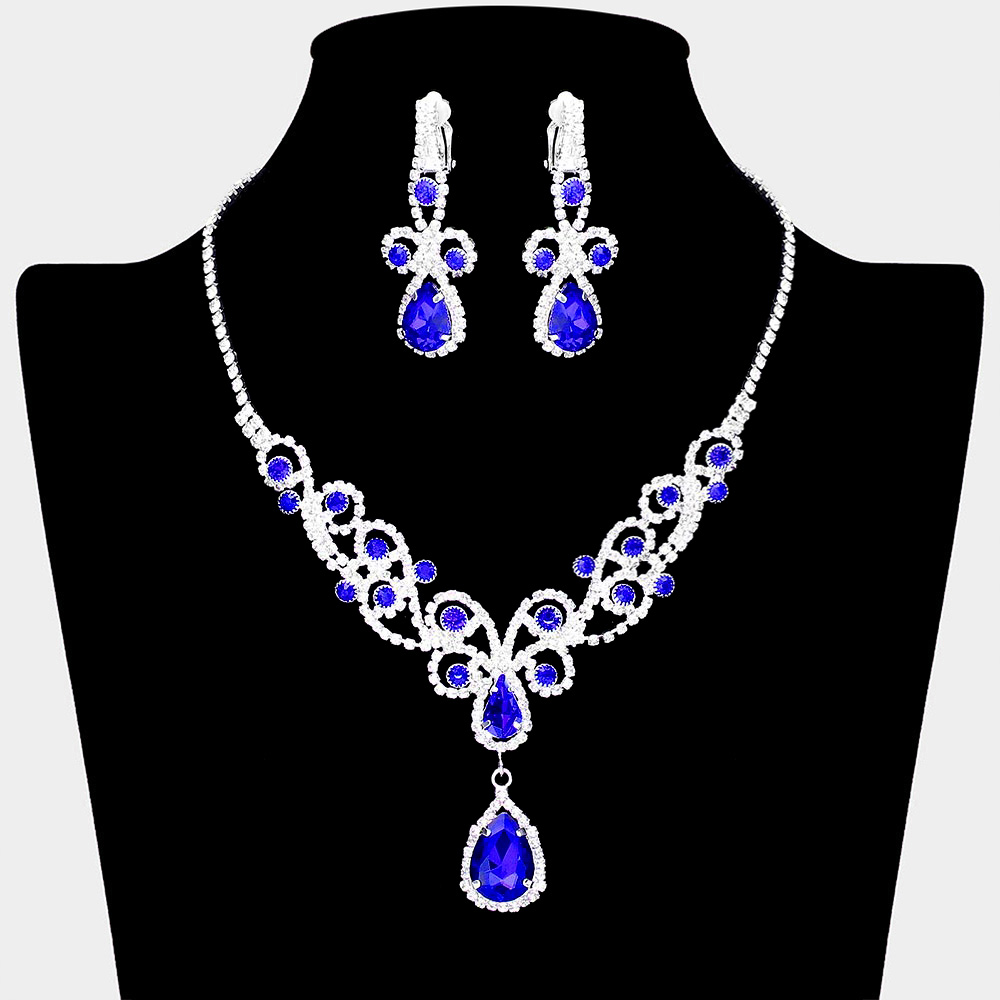 Teardrop Crystal Rhinestone Vine Drop Collar Necklace Clip on Earring Set