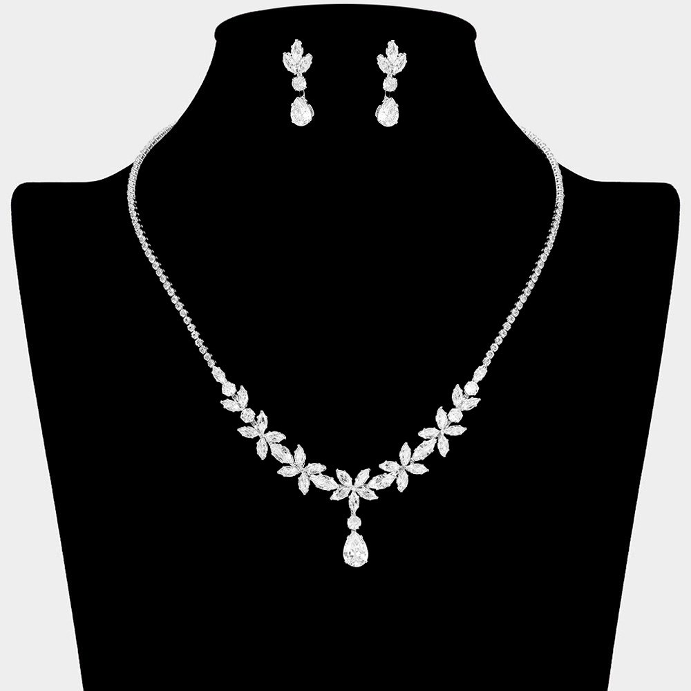 Details • Necklace Size : 16.5" + 4.5" L • Decor Size : 1.2" L • Earrings Size : 0.9" L • Refined necklace and earring set featuring a graceful drop centerpiece and coordinated accents. Designed to elevate bridal looks, formal outfits, and special occasion styling. A timeless statement set that adds polished elegance to weddings, parties, and evening wear. • CZ Cubic Zirconia