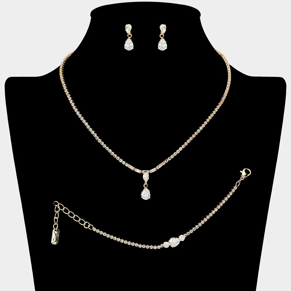 • This radiant jewelry set features a delicate teardrop crystal design across a matching necklace, bracelet, and earrings. With a gold-tone finish and refined sparkle, it adds timeless elegance and charm, perfect for weddings, evening occasions, or formal celebrations.
