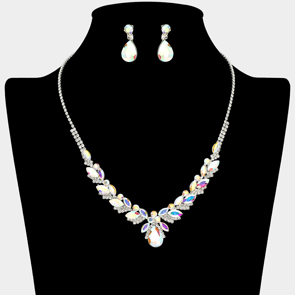 Details • Necklace Size : 17" + 4" L • Decor Size : 1" L • Earrings Size : 1" L • This elegant statement necklace and matching earring set features layered teardrop accents that create a dramatic yet refined silhouette. Designed to highlight the neckline with graceful sparkle, it is ideal for formal occasions, bridal styling, evening events, and upscale boutique collections.
