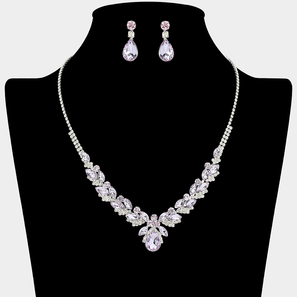 Details • Necklace Size : 17" + 4" L • Decor Size : 1" L • Earrings Size : 1" L • This elegant statement necklace and matching earring set features layered teardrop accents that create a dramatic yet refined silhouette. Designed to highlight the neckline with graceful sparkle, it is ideal for formal occasions, bridal styling, evening events, and upscale boutique collections.