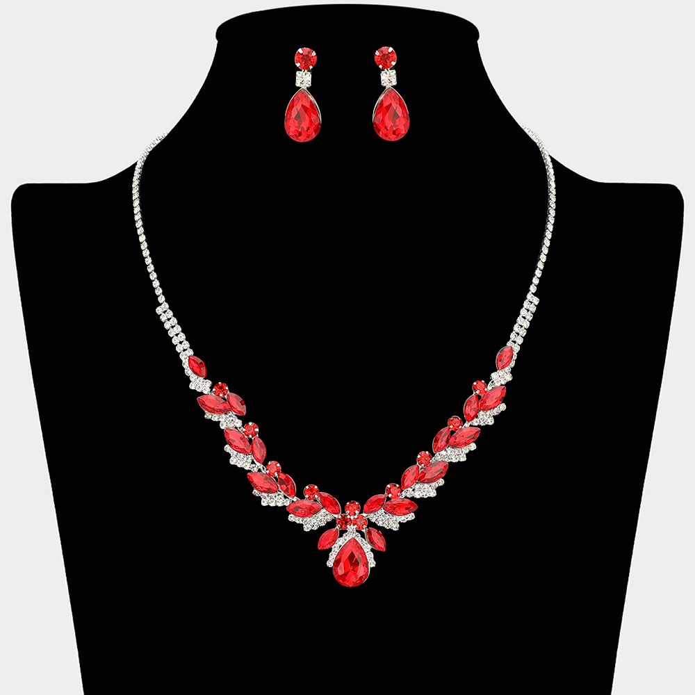 Details • Necklace Size : 17" + 4" L • Decor Size : 1" L • Earrings Size : 1" L • This elegant statement necklace and matching earring set features layered teardrop accents that create a dramatic yet refined silhouette. Designed to highlight the neckline with graceful sparkle, it is ideal for formal occasions, bridal styling, evening events, and upscale boutique collections.