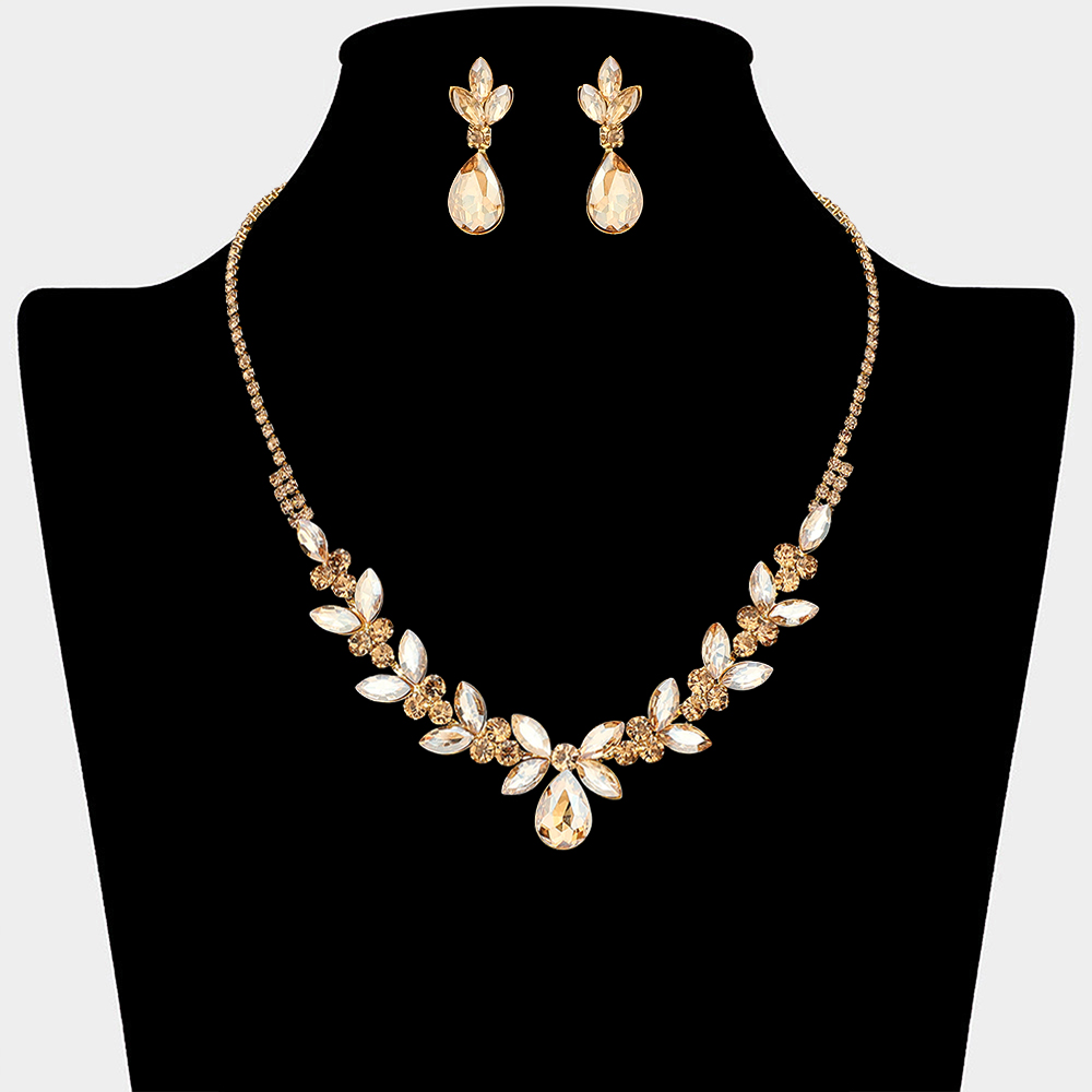 • This elegant necklace and matching earring set features a leaf-inspired design with a graceful drop centerpiece that frames the neckline beautifully. Perfect for weddings, formal events, proms, and evening occasions, it adds refined sparkle and a timeless statement to special occasion looks.