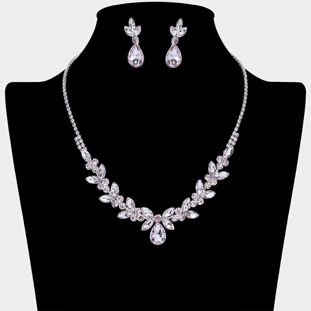 • This elegant necklace and matching earring set features a leaf-inspired design with a graceful drop centerpiece that frames the neckline beautifully. Perfect for weddings, formal events, proms, and evening occasions, it adds refined sparkle and a timeless statement to special occasion looks.