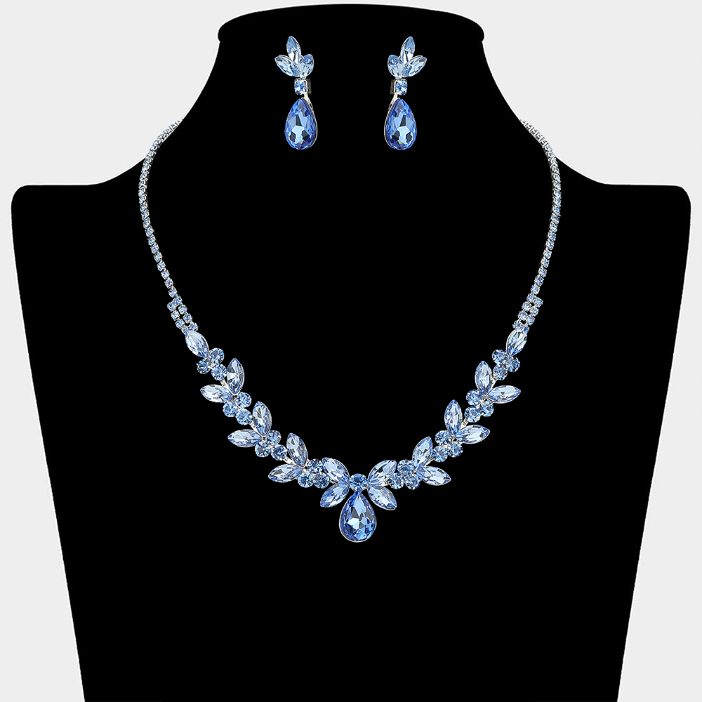 • This elegant necklace and matching earring set features a leaf-inspired design with a graceful drop centerpiece that frames the neckline beautifully. Perfect for weddings, formal events, proms, and evening occasions, it adds refined sparkle and a timeless statement to special occasion looks.