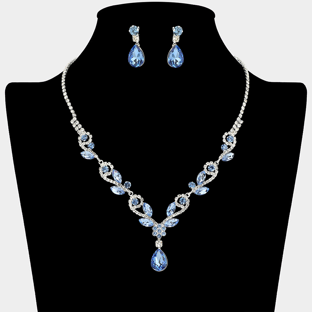 Details • Necklace Size : 16" + 4.5" L • Decor Size : 1.24" L • Earrings Size : 1" L • This elegant necklace and matching earring set features a graceful teardrop design with layered crystal details that highlight the neckline beautifully. Ideal for weddings, formal events, proms, and evening occasions, it delivers timeless elegance and eye-catching sparkle for special celebrations.