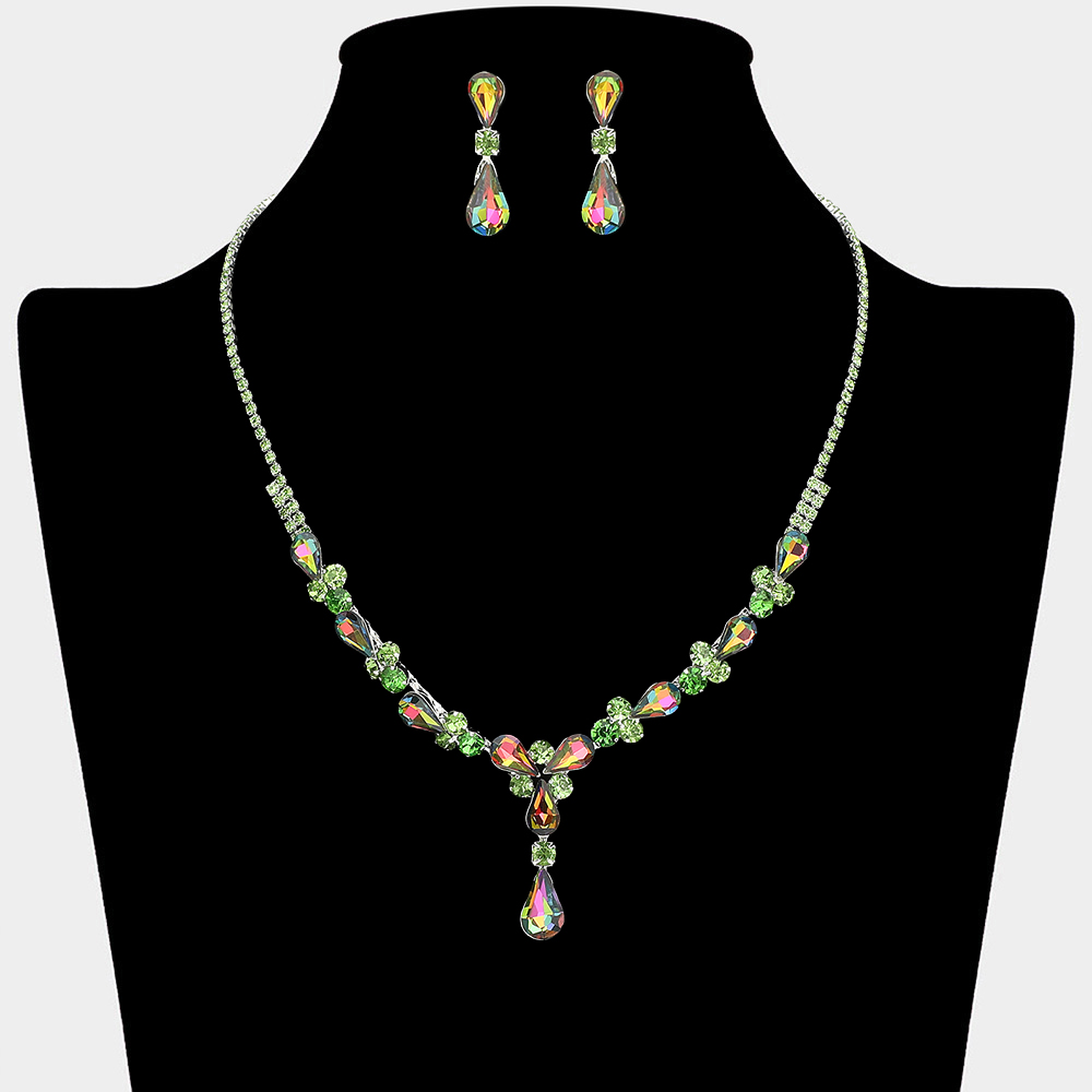 Details • Necklace Size : 16" + 4.5" L • Decor Size : 1.24" L • Earrings Size : 1.2" L • This elegant necklace and earring set features a graceful teardrop crystal design that highlights the neckline with refined sparkle. Ideal for weddings, bridal looks, formal occasions, and evening wear, it delivers a timeless statement that complements gowns, dresses, and special event styling with effortless sophistication.