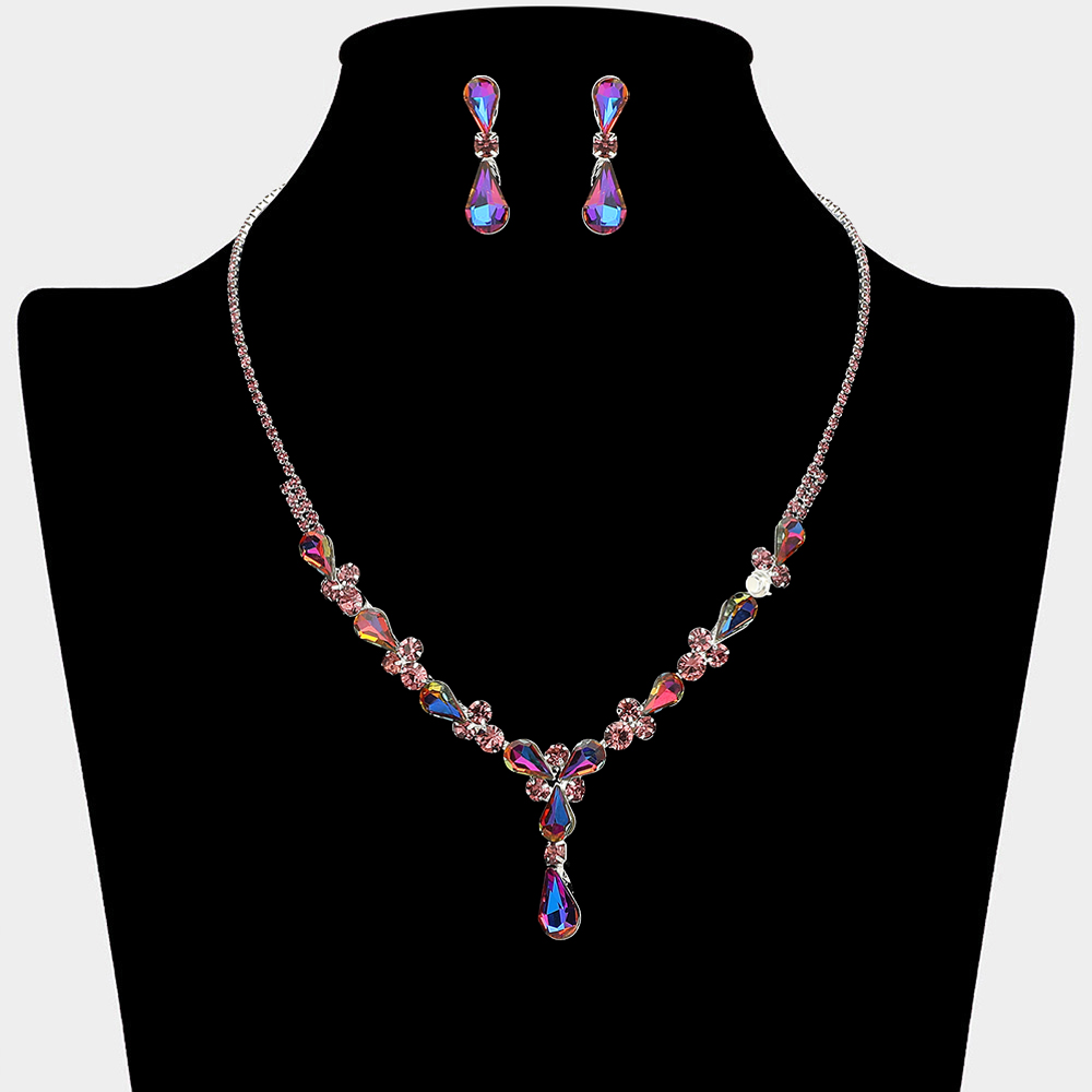 • This elegant necklace and earring set features a graceful teardrop crystal design that highlights the neckline with refined sparkle. Ideal for weddings, bridal looks, formal occasions, and evening wear, it delivers a timeless statement that complements gowns, dresses, and special event styling with effortless sophistication.
