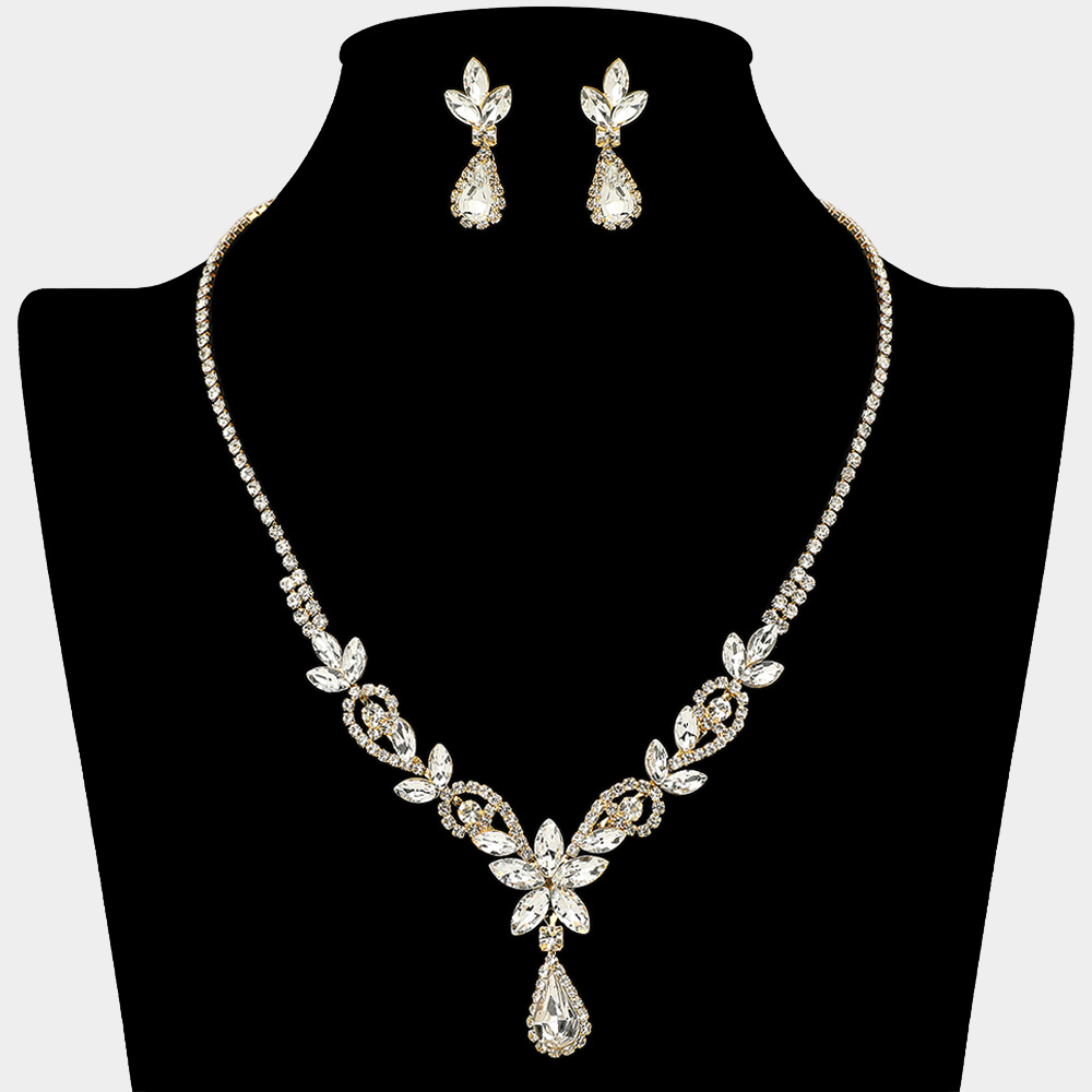 • This exquisite rhinestone necklace and earring set features a graceful teardrop pendant accented by delicate leaf motifs. Perfect for weddings, galas, and formal occasions, it adds timeless sparkle and refined beauty, creating a sophisticated statement for any elegant ensemble.